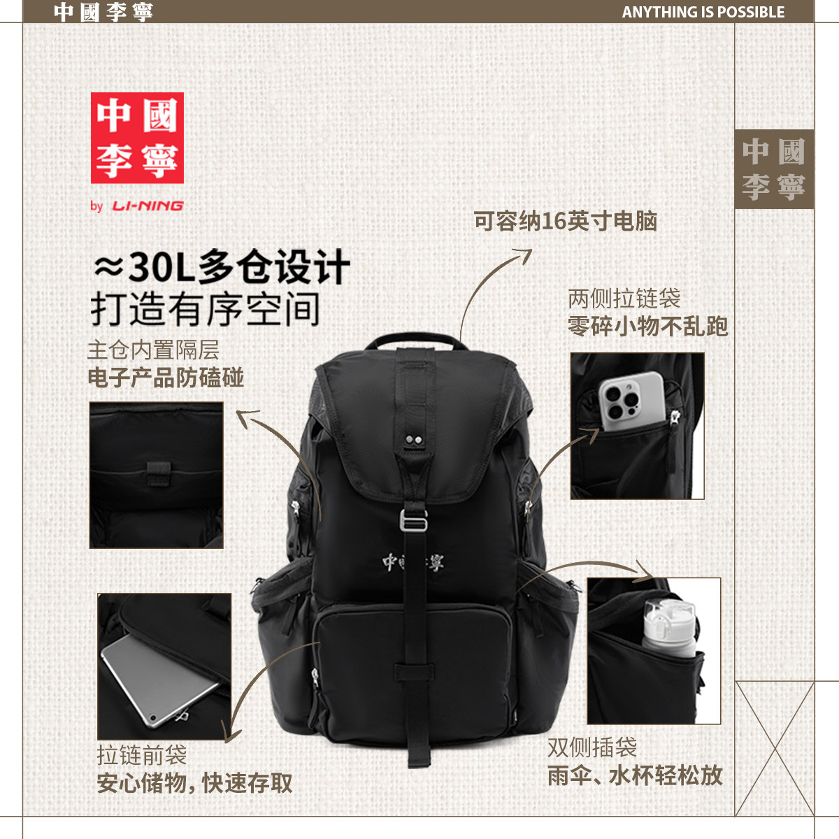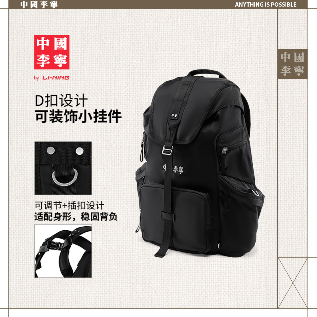 中国李宁双肩包男包女包2026新款官方正品轻便旅行书包学生运动包