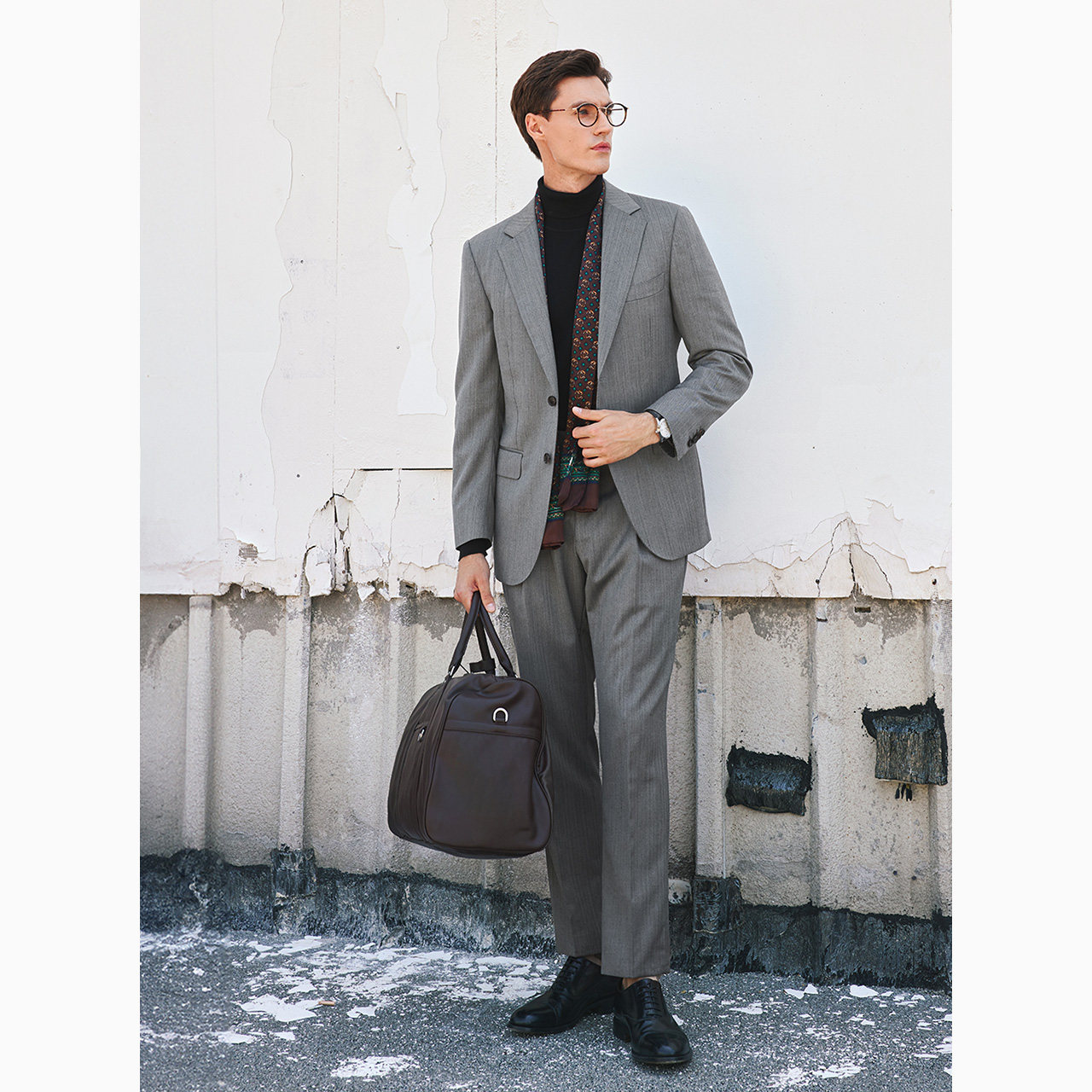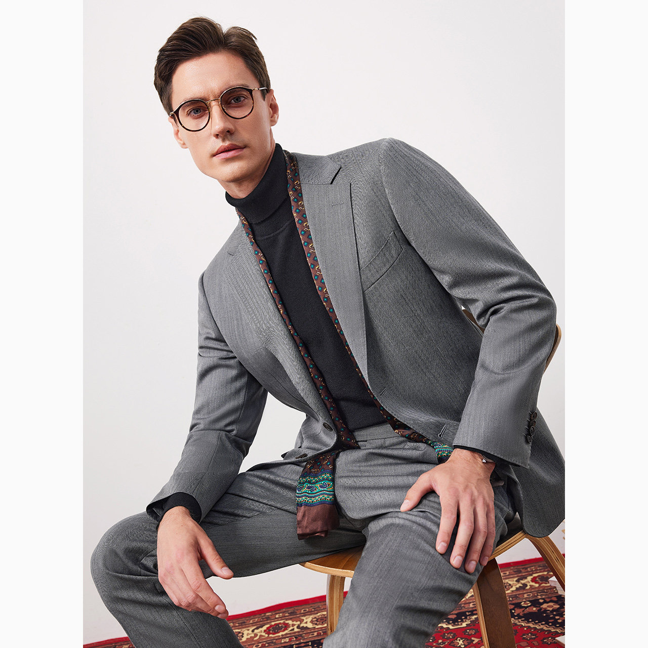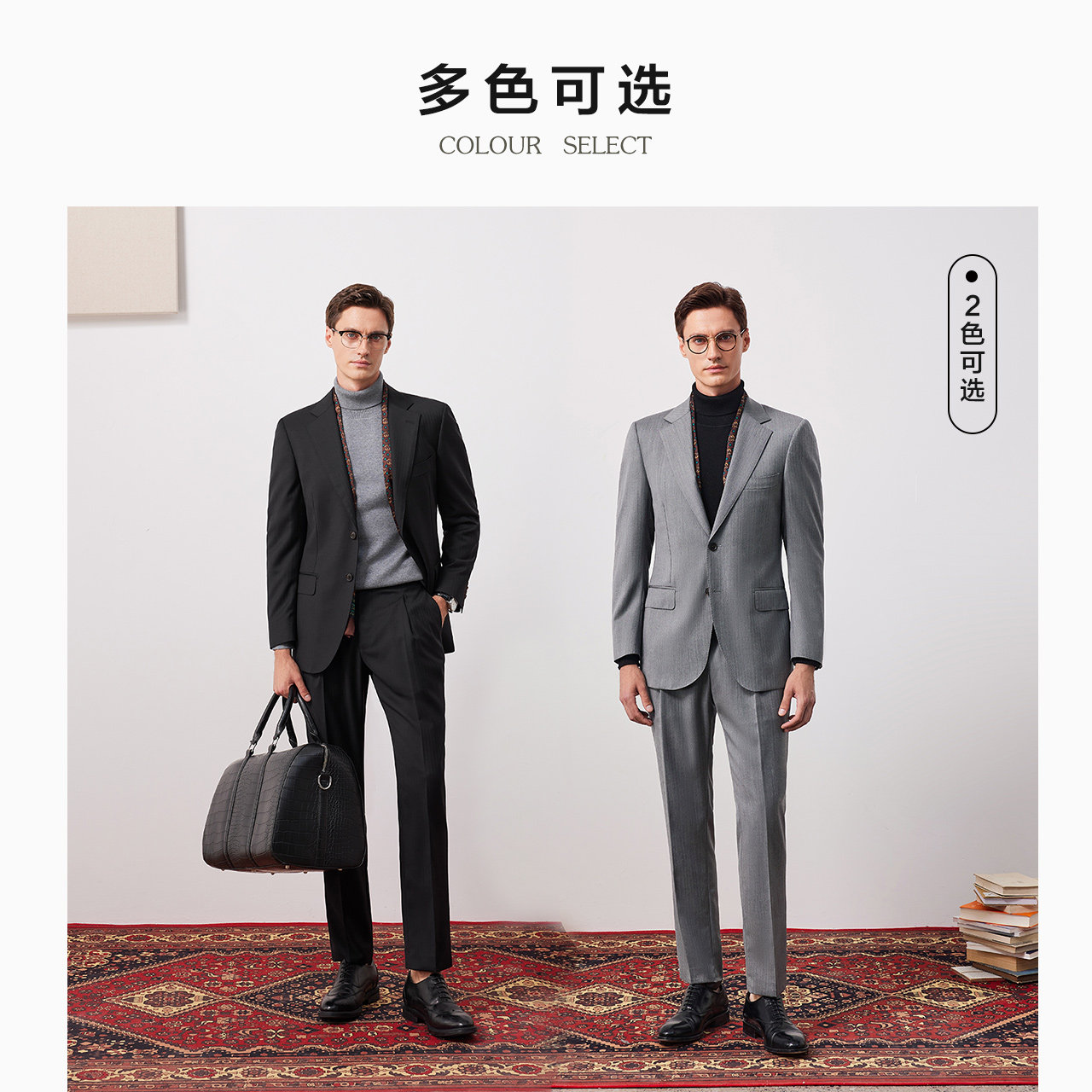柏品纯羊毛人字纹西服套装男士平驳领商务休闲正装职业单排扣西装