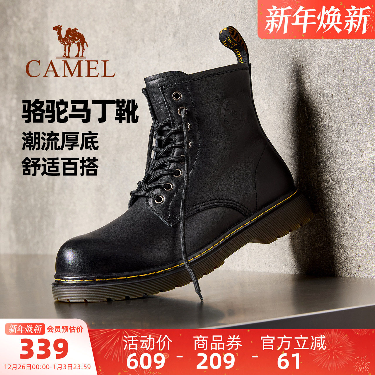骆驼男鞋2025秋冬新款牛皮英伦潮流靴子增高厚底复古黑色马丁靴男