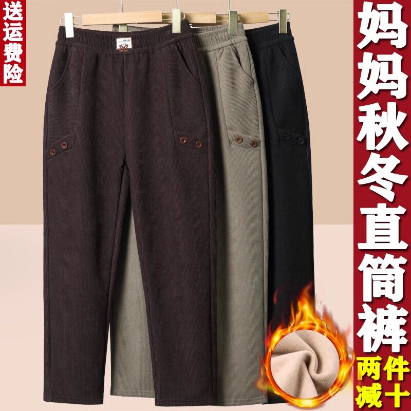 妈妈裤子春秋款松紧高腰弹力中老年女裤宽松大码直筒奶奶加绒长裤