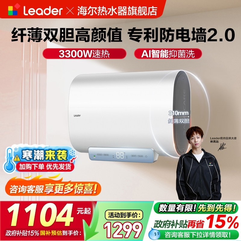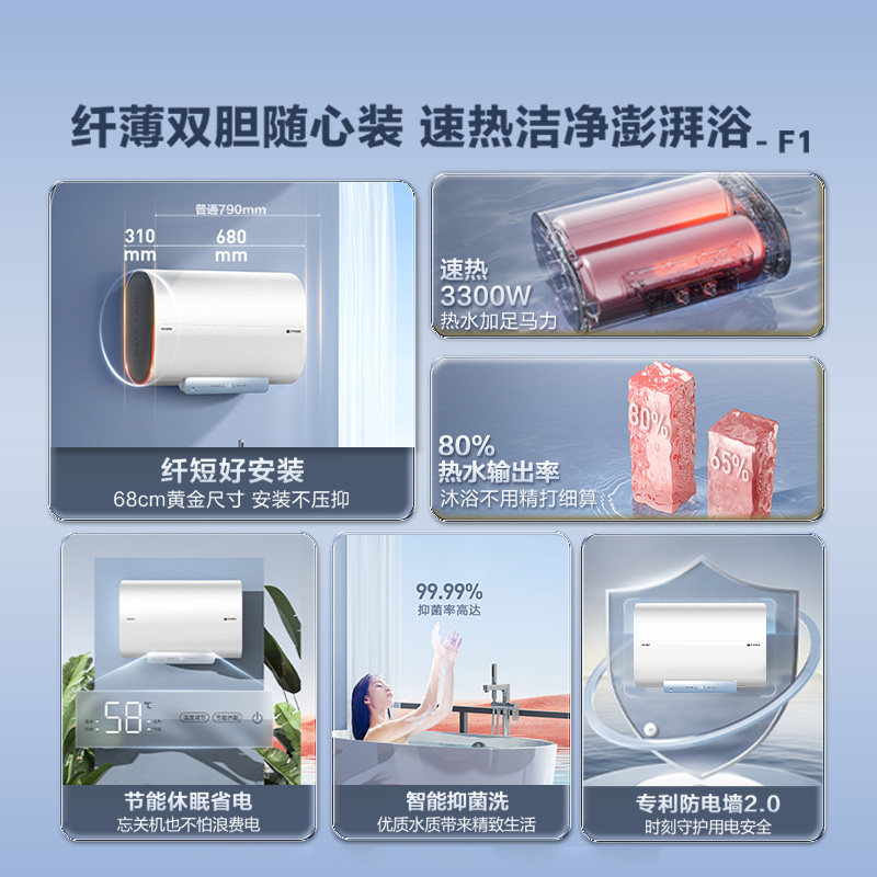 海尔出品统帅电热水器家用洗澡双胆短小纤薄扁桶速热节能60升F1