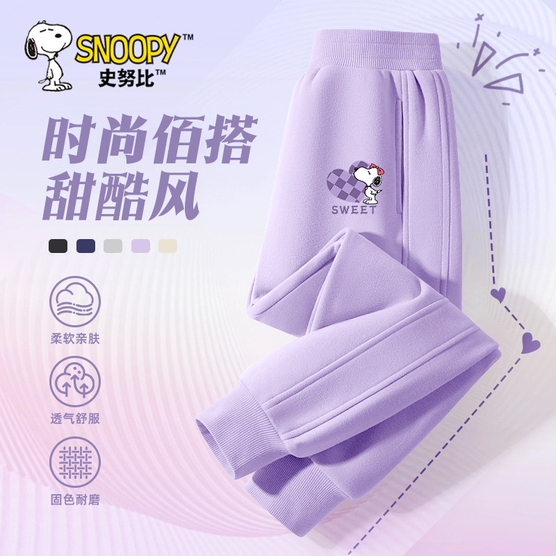 史努比女童紫色裤子春秋款女大童双切线卫裤2025新款儿童休闲长裤