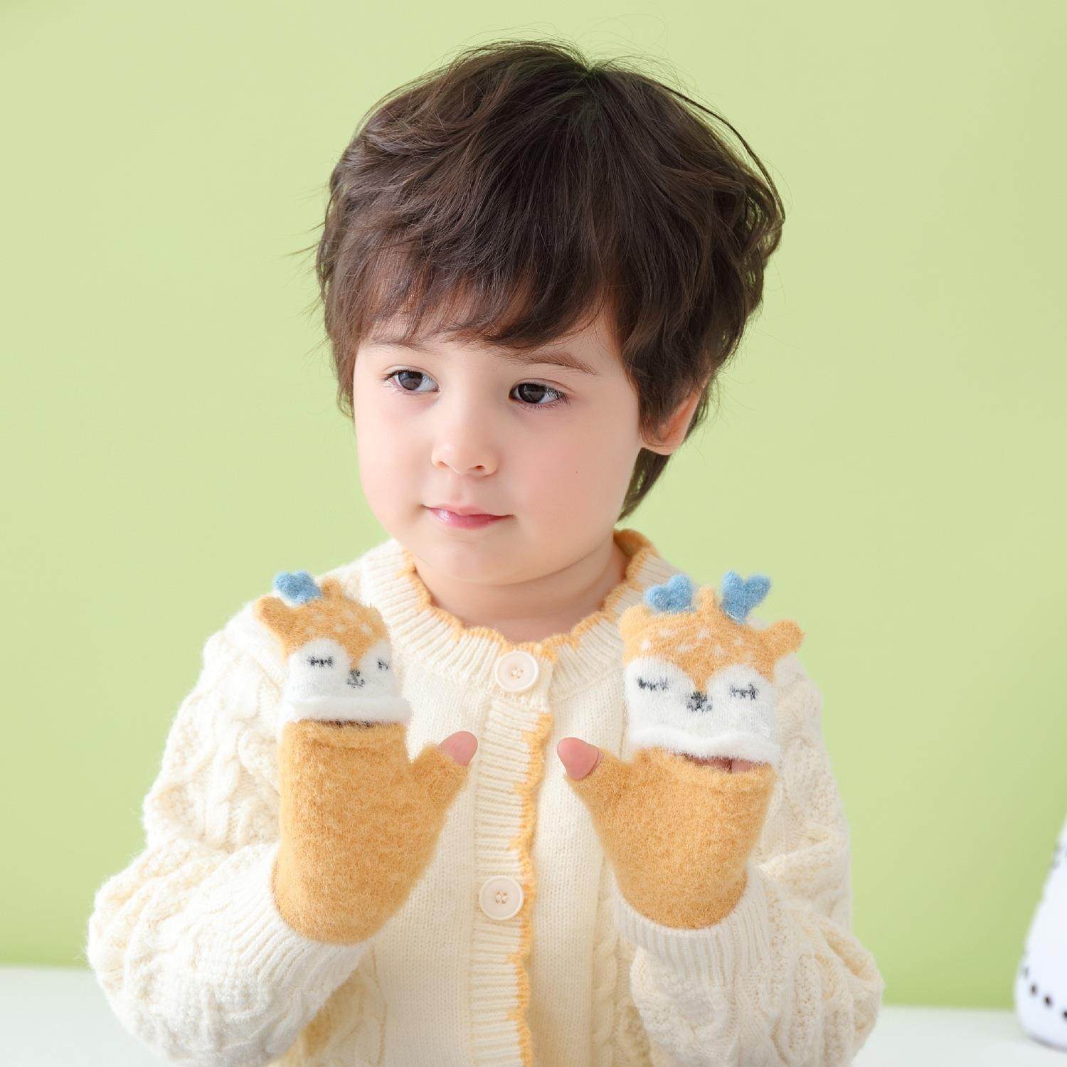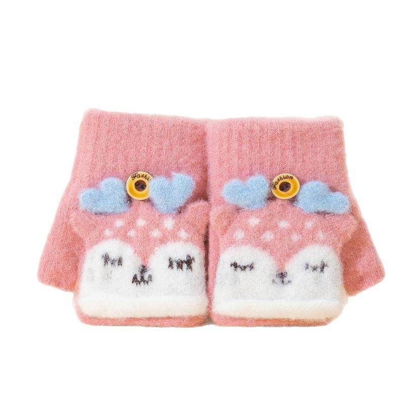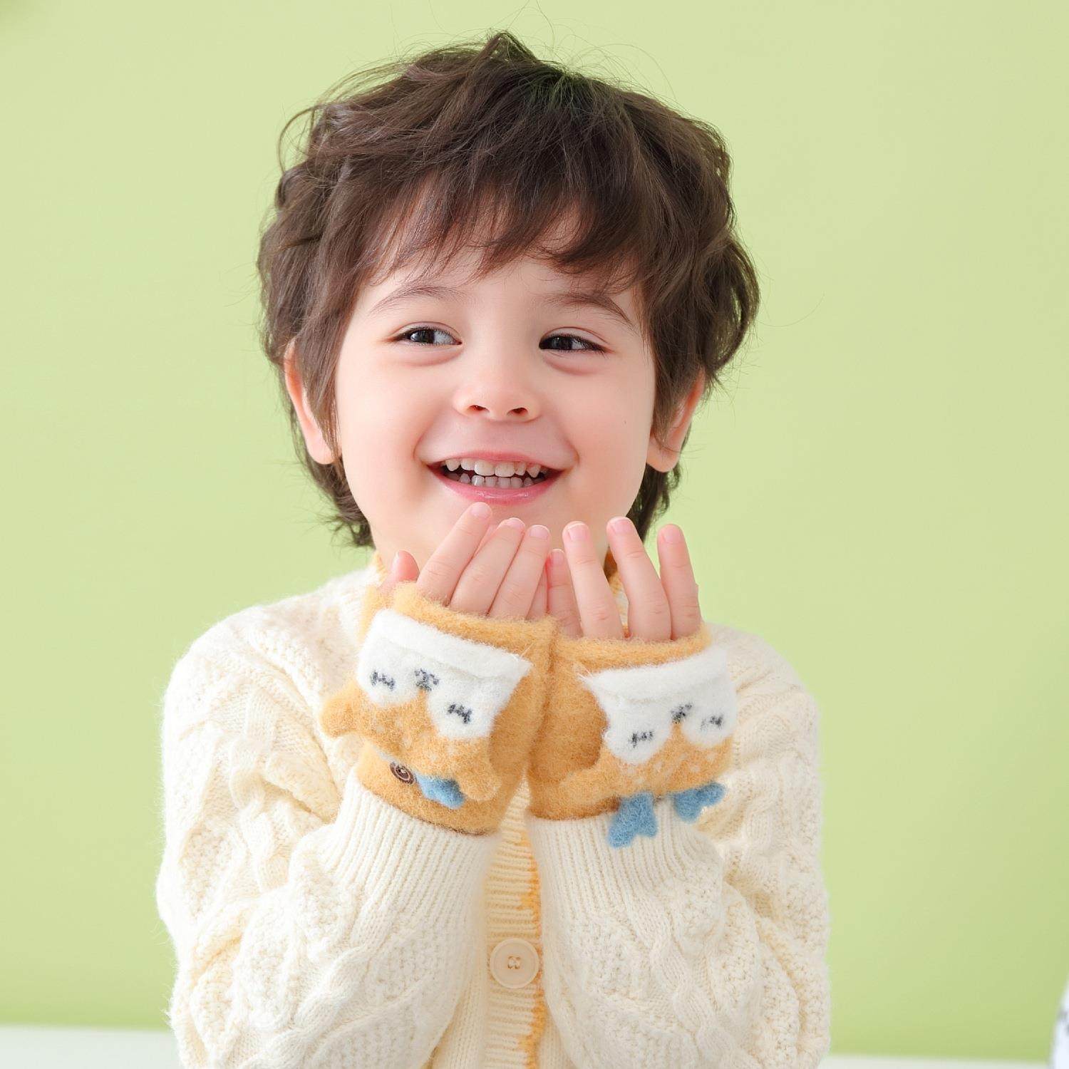儿童手套半指翻盖冬天季保暖毛绒小学生女孩男童宝宝可爱露指写字