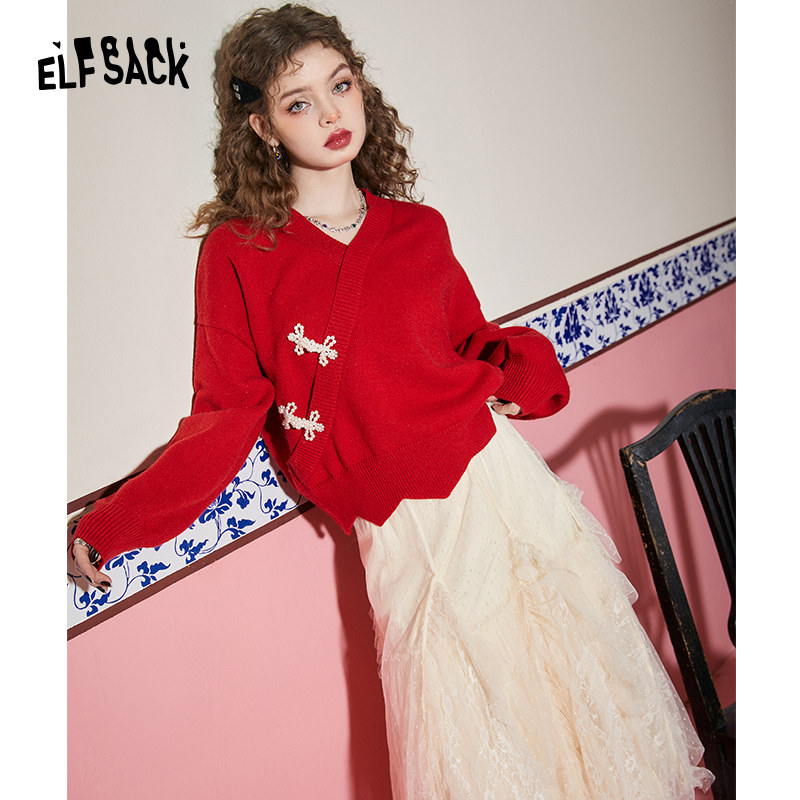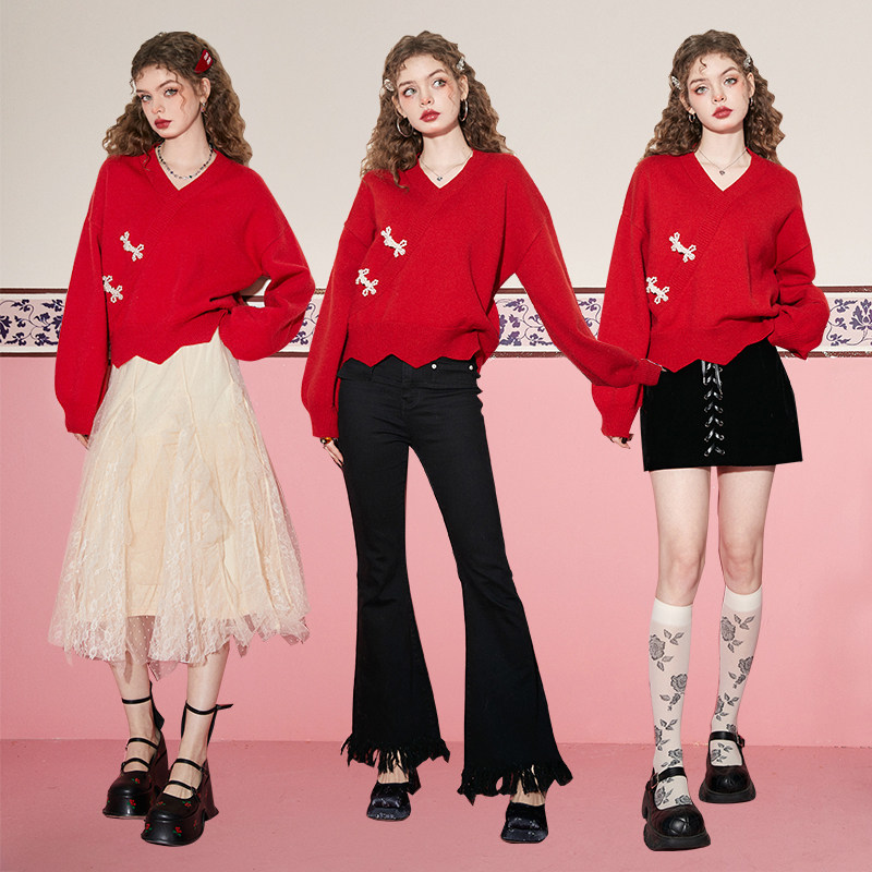 妖精的口袋珍珠盘扣v领红色毛衣女2026年冬季新款新中式国风上衣