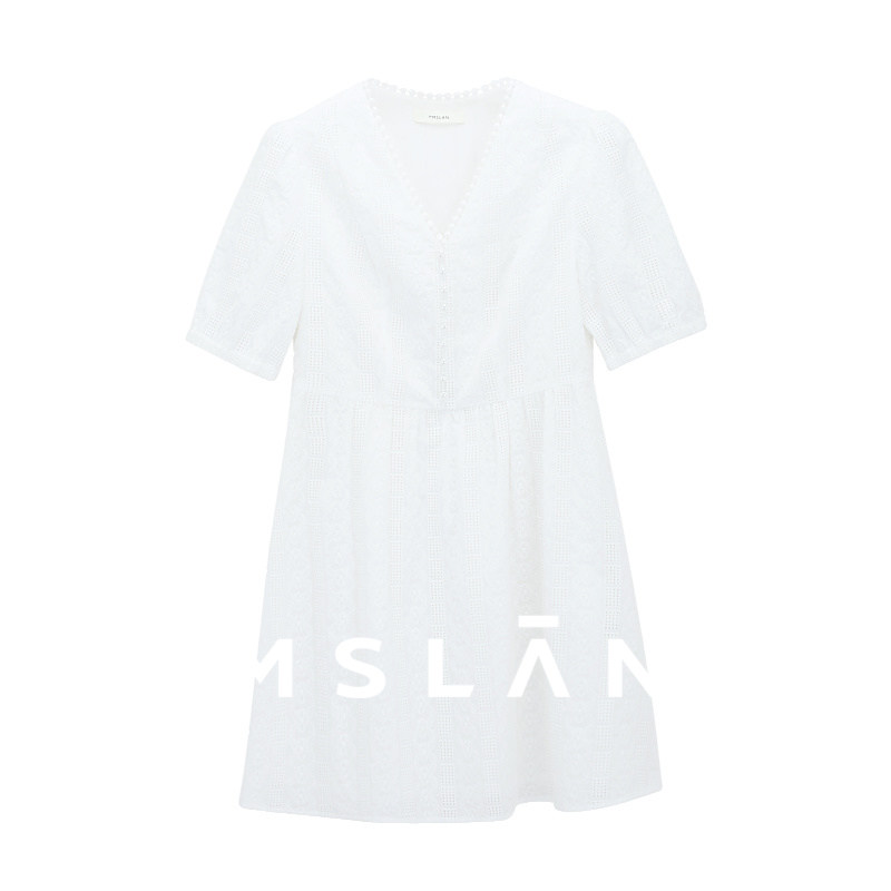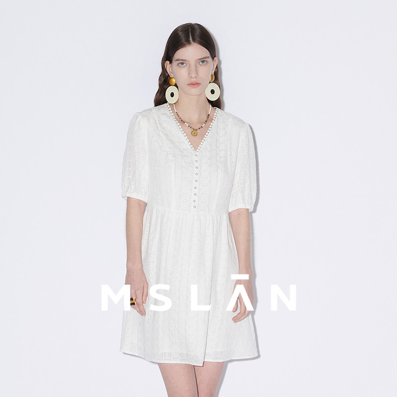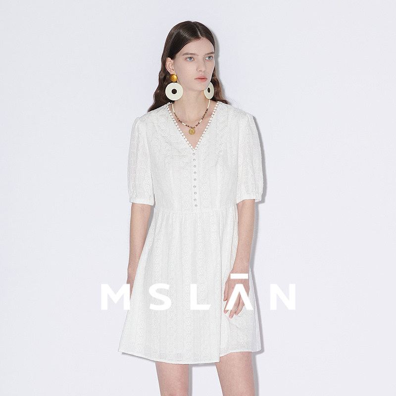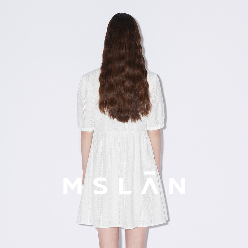 【镂空蕾丝】MSLAN春夏气质度假泡泡袖收腰中长连衣裙MFBM4122