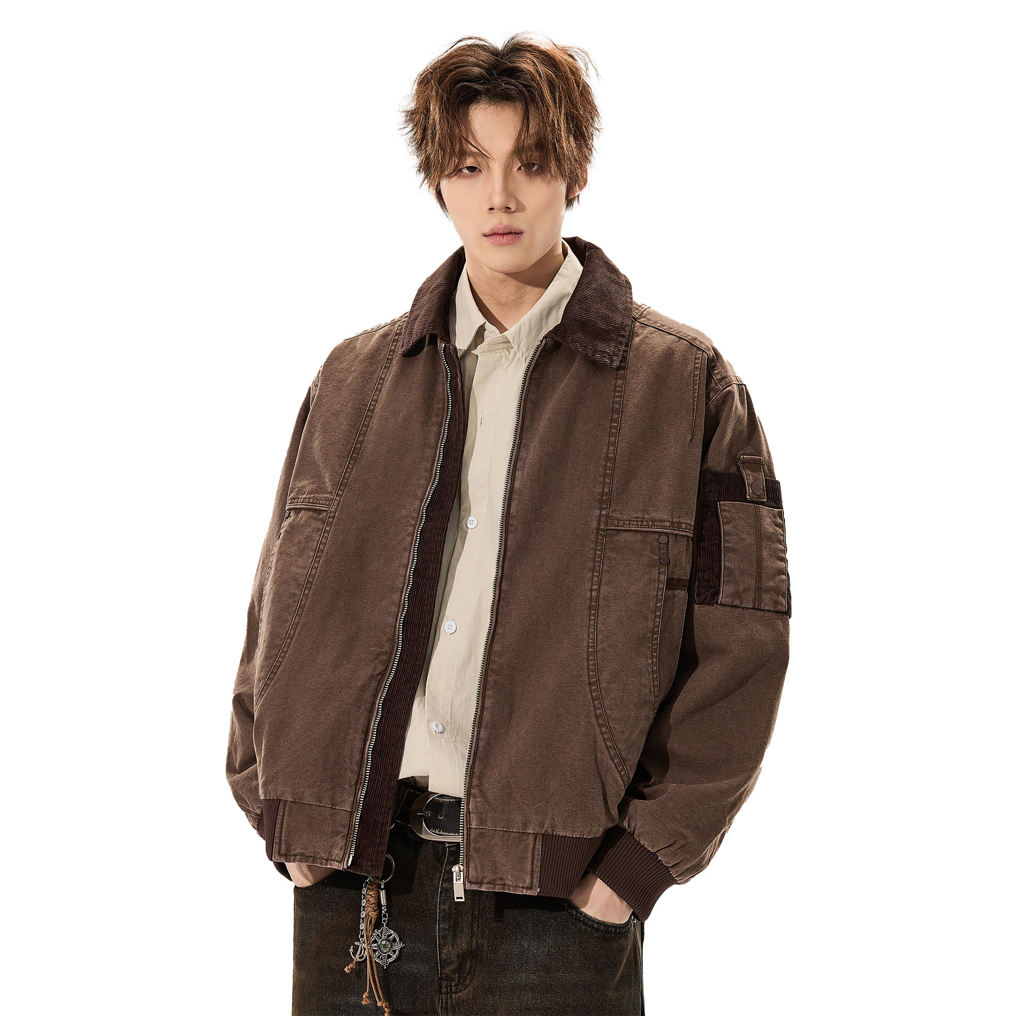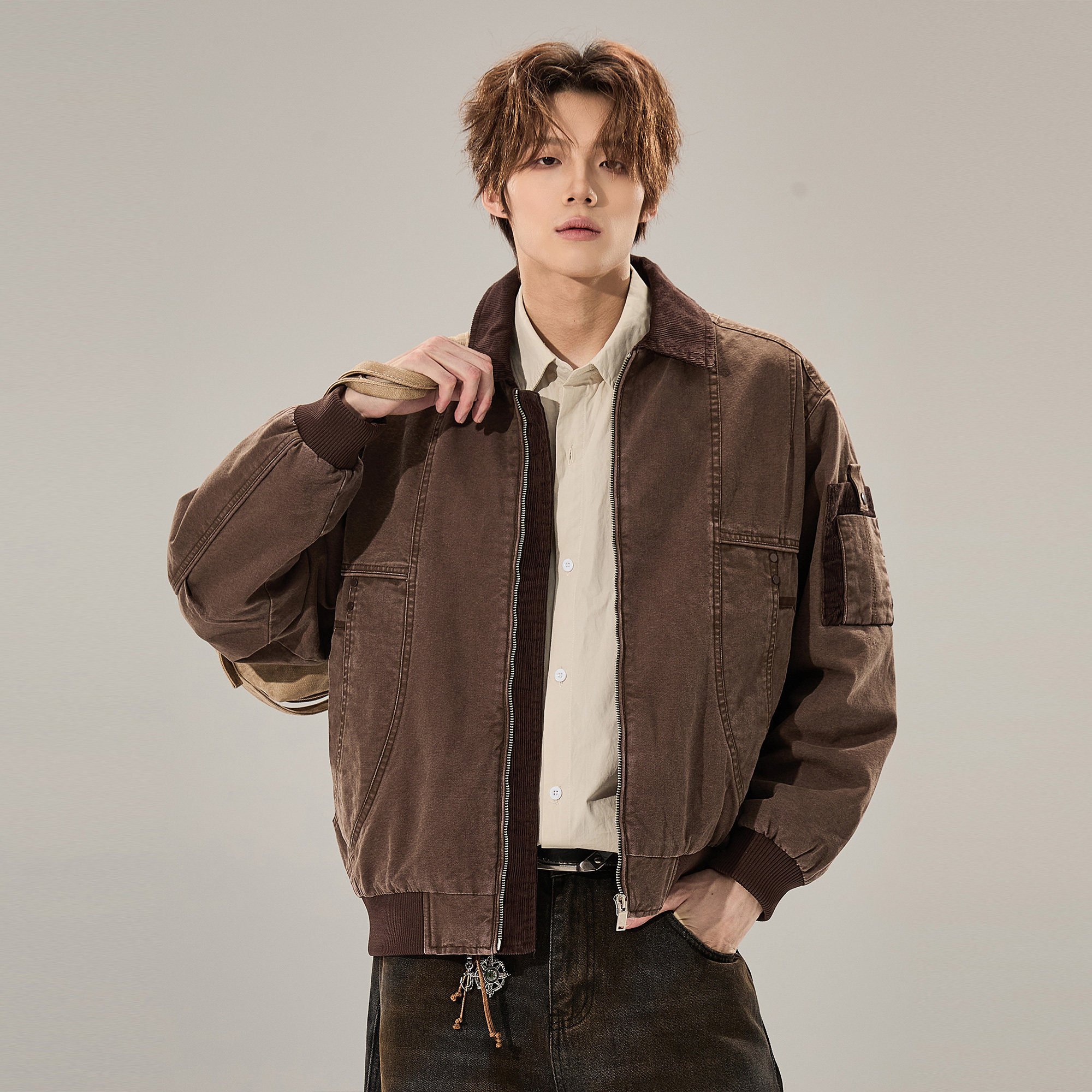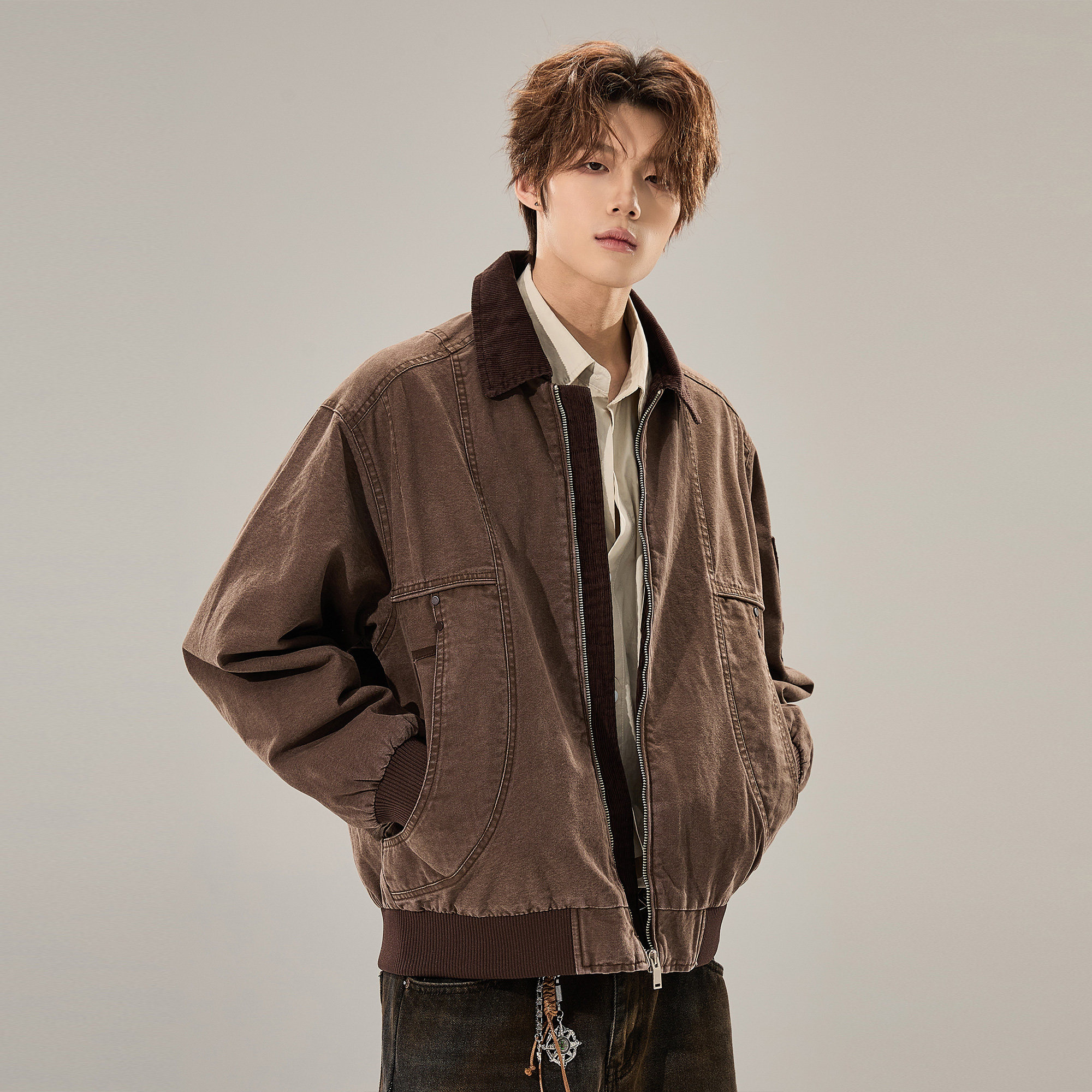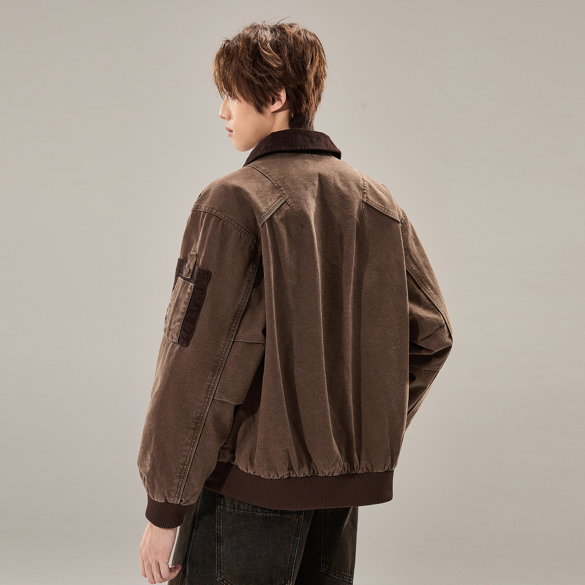 ALLIN 纯棉工装水洗牛仔外套男春秋灯芯绒领拼接廓形宽松情侣外套