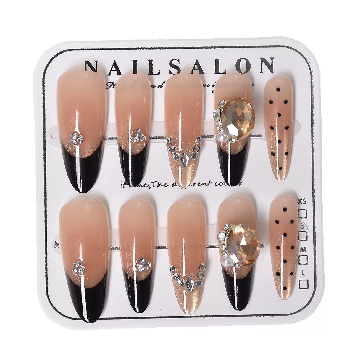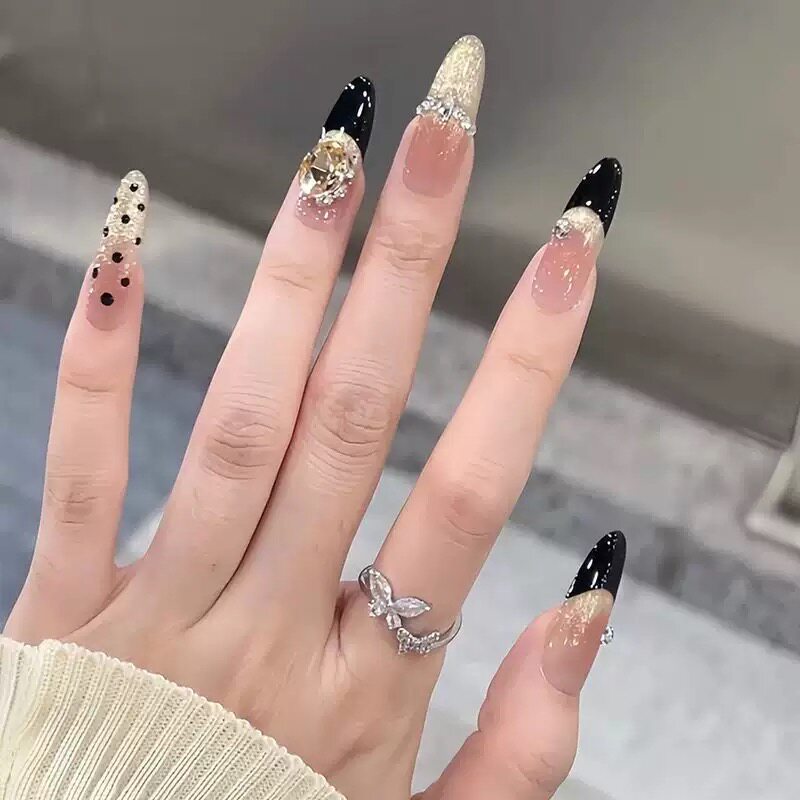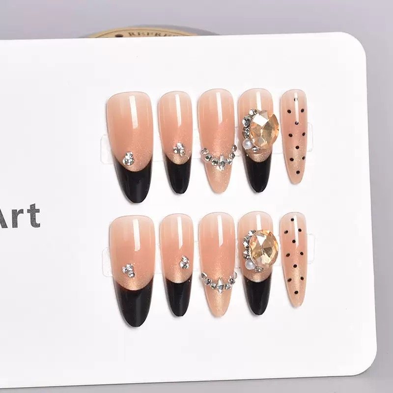 新年款黑色法式猫眼穿戴甲片长款杏仁手工贴钻穿戴甲高级感黑皮