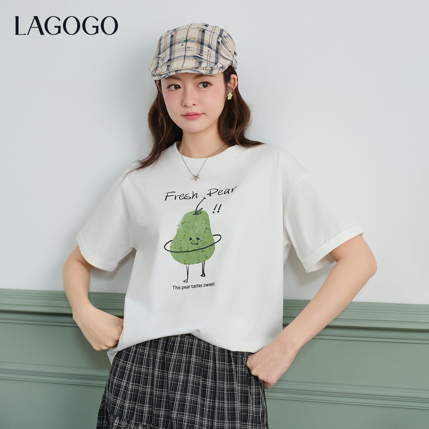 LAGOGO青梨印花宽松短袖T恤女拉谷谷2026春新款圆领休闲白色上衣