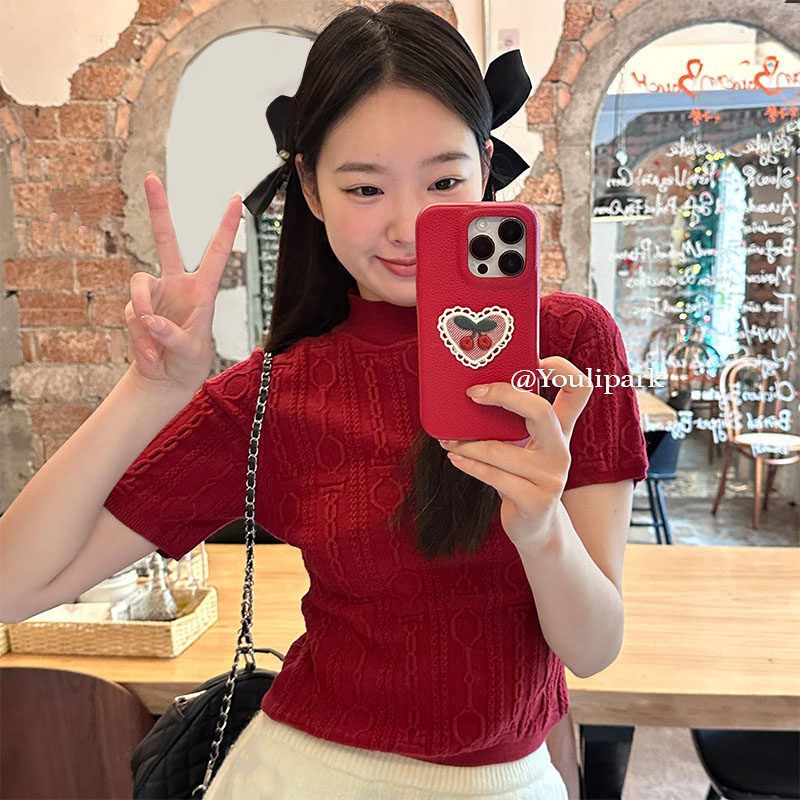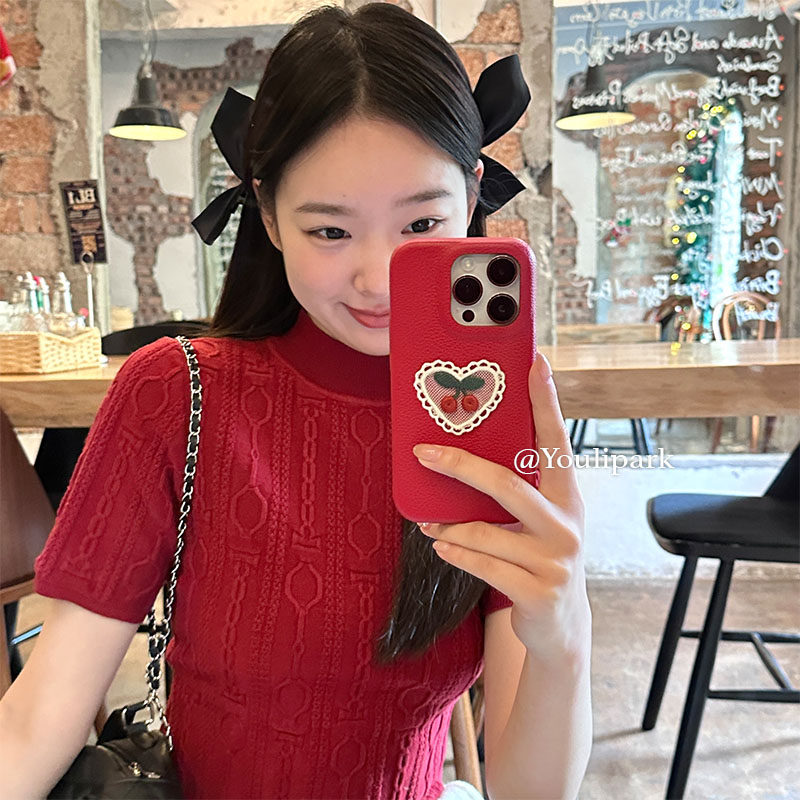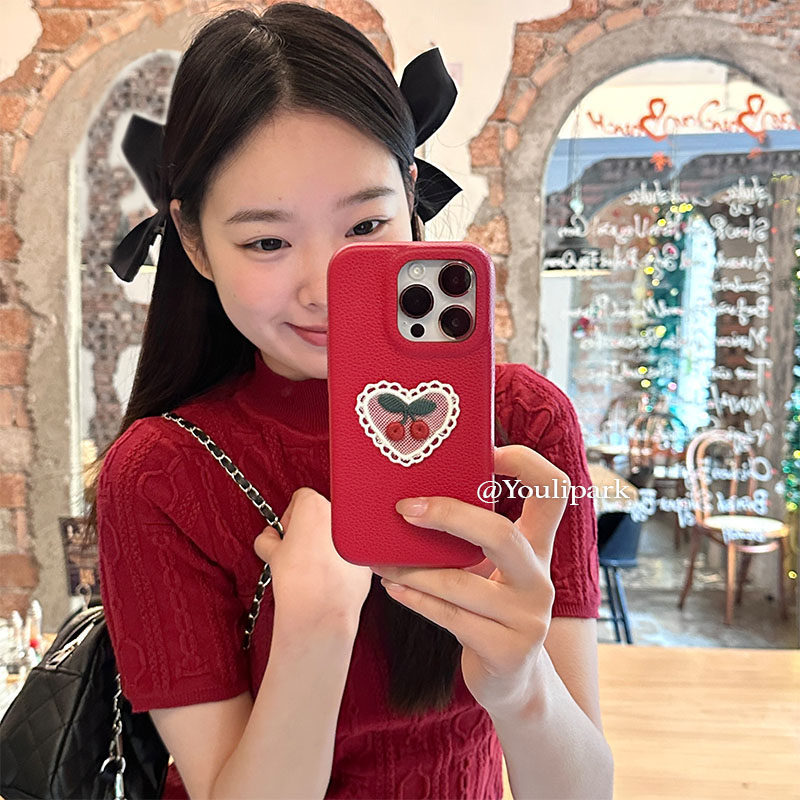由里公园ins小众少女爱心蕾丝刺绣樱桃15适用17pro苹果17ProMax手机壳iPhone16全包17秋冬14Promax保护套皮质