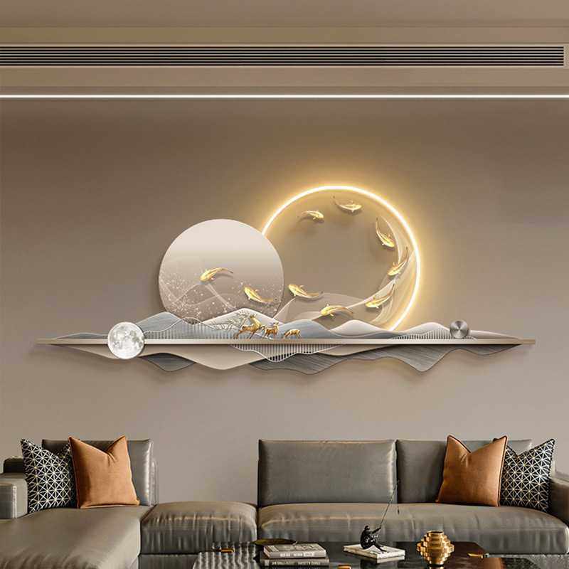 现代轻奢客厅装饰画九鱼图高档灯画高级感沙发背景墙壁画立体壁饰