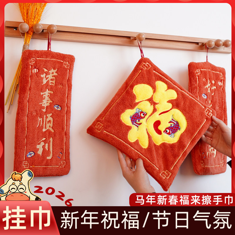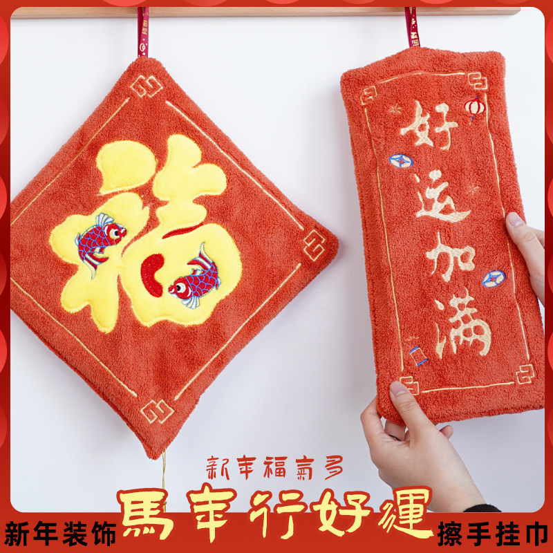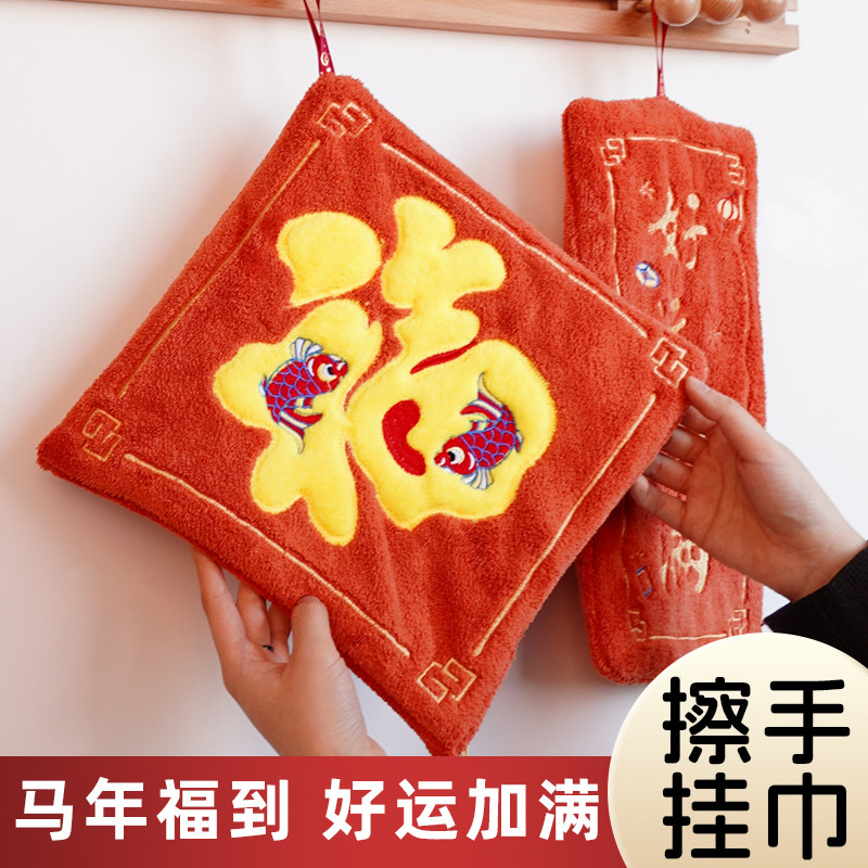 福字擦手巾可挂式喜庆对联挂巾厨房手帕加厚强吸水新年擦手小毛巾