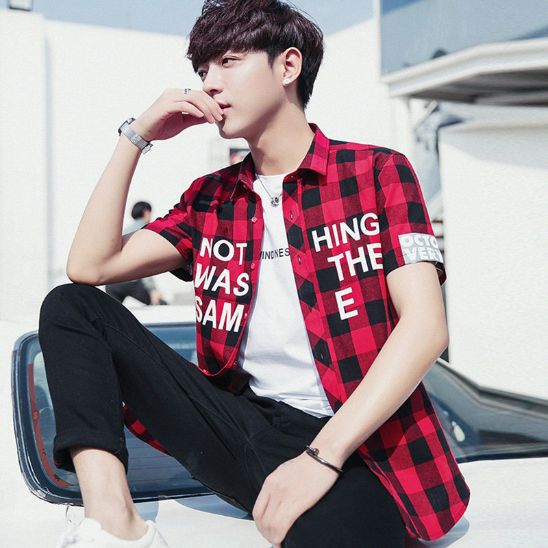 男士个性七分袖衬衫发型师夏季薄款外套休闲衬衣潮流格子短袖寸衫