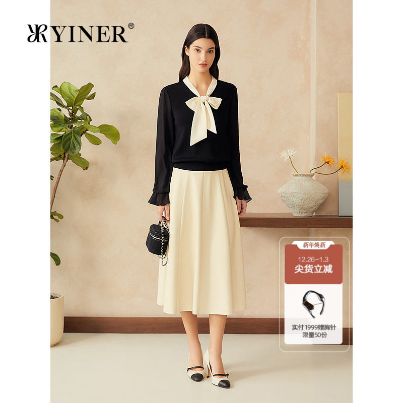 YINER音儿专选2025春季新款法式珍珠扣饰蝴蝶结雪纺袖拼接针织衫