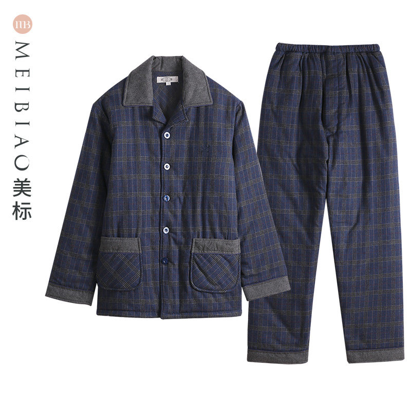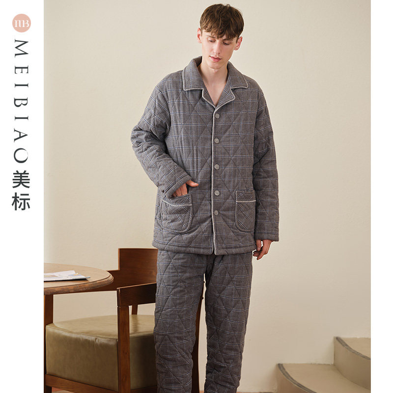 美标秋冬男士三层加厚保暖夹棉纯棉睡衣套装全棉质休闲格子家居服