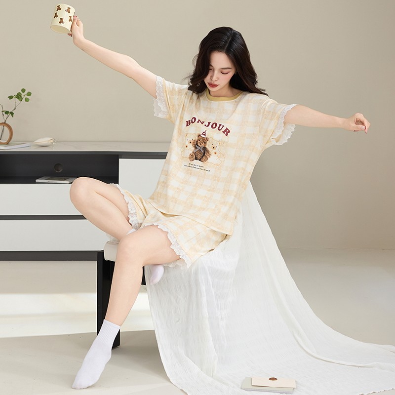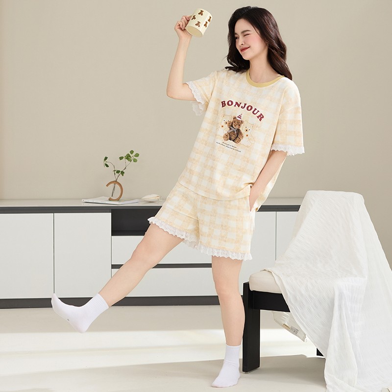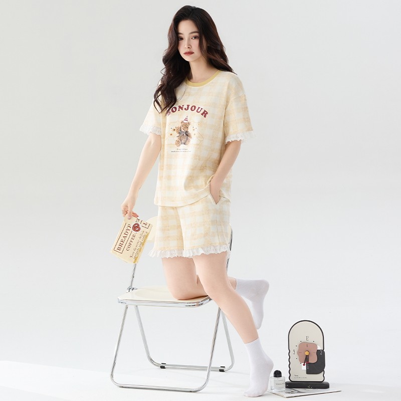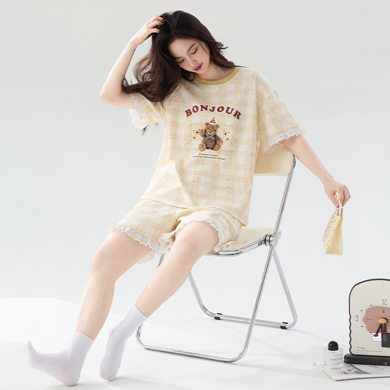 都市丽人睡衣女士夏季纯棉短袖短裤圆领套头女款卡通家居服套装