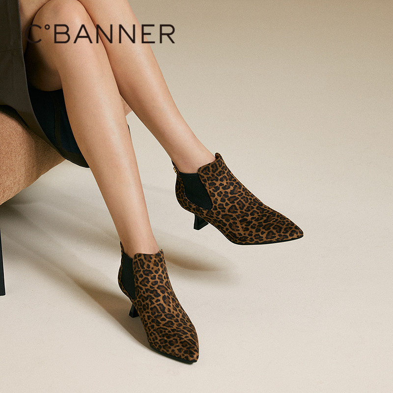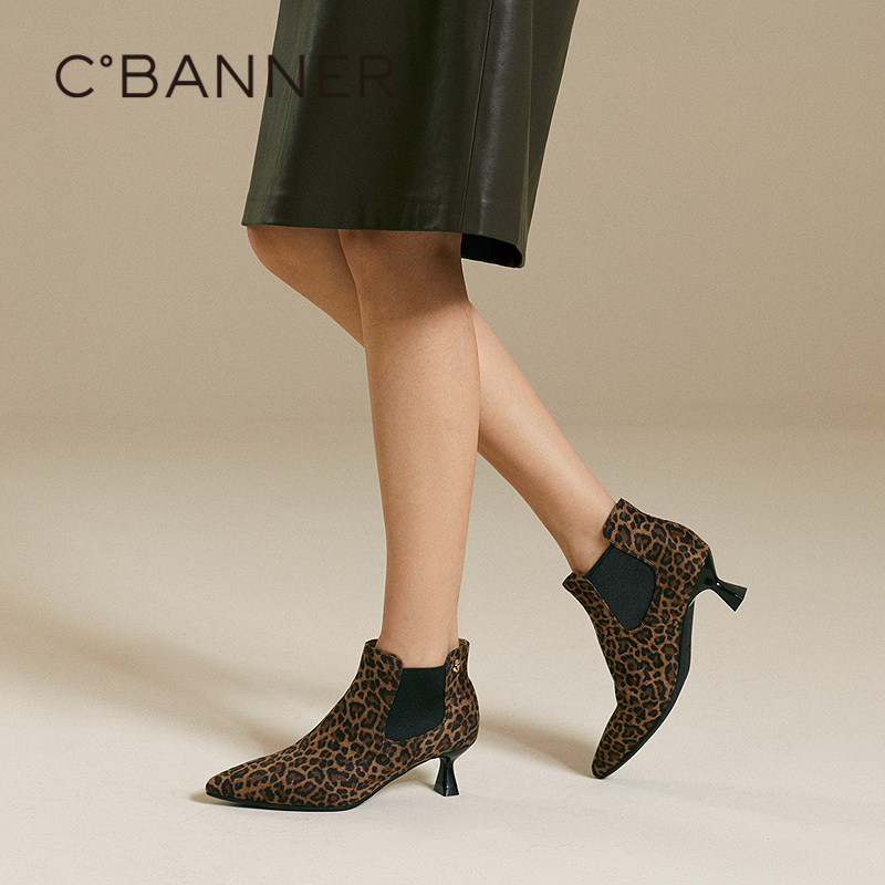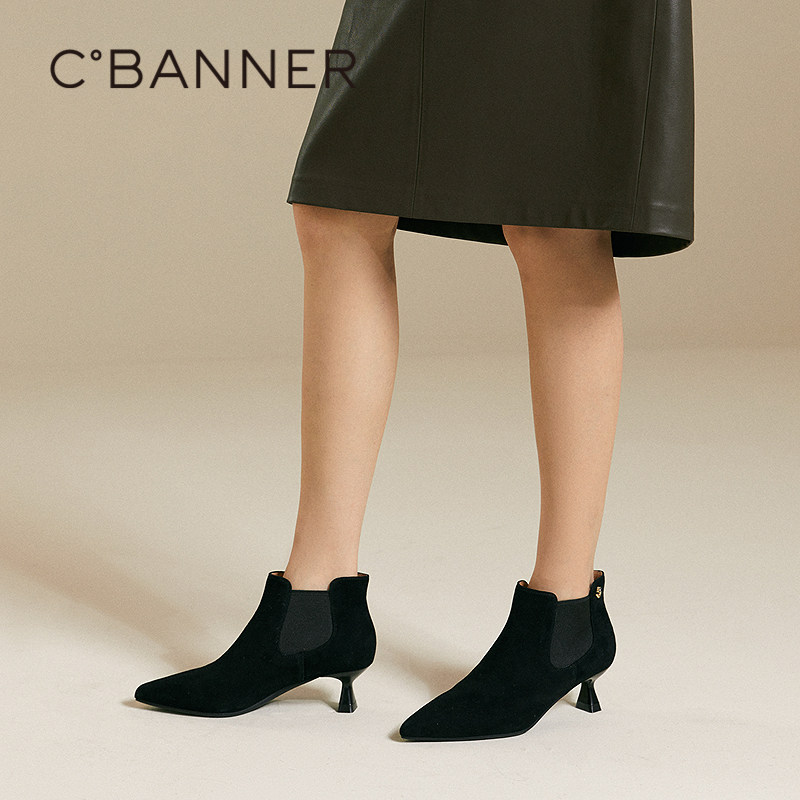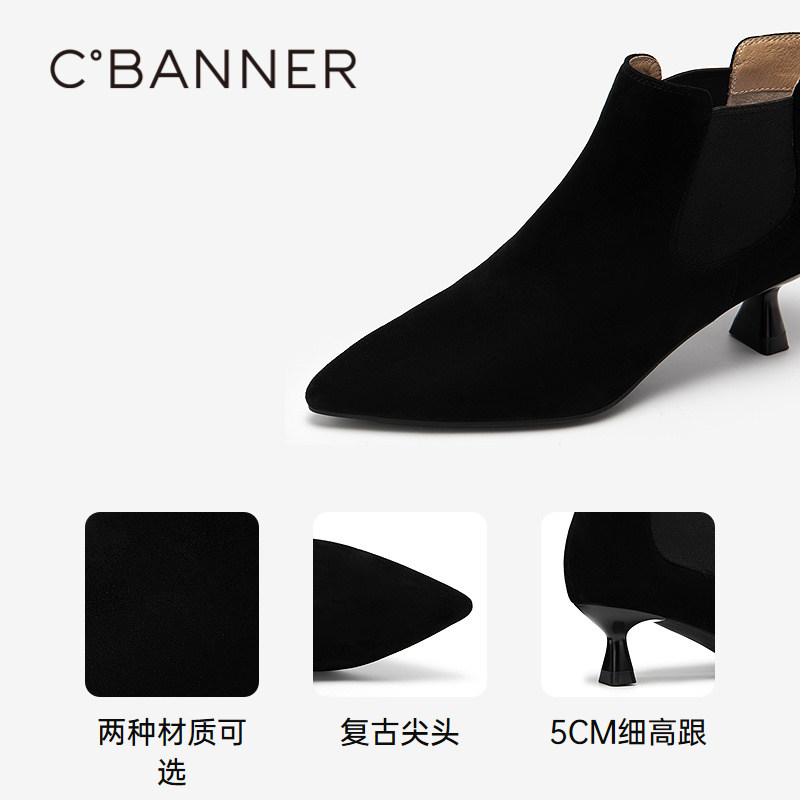 千百度复古尖头中跟时装靴女2025年冬季新款气质细高跟通勤踝靴