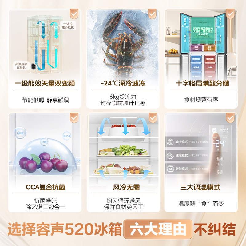 容声520L大容量十字对开双开四门家用超薄嵌入式冰箱以旧换新补贴