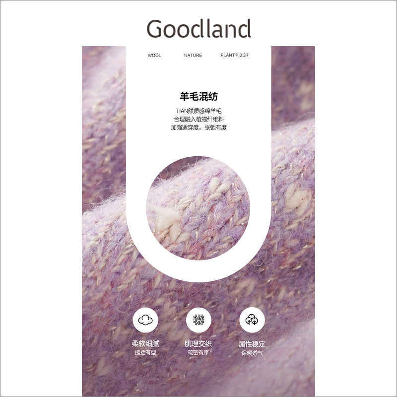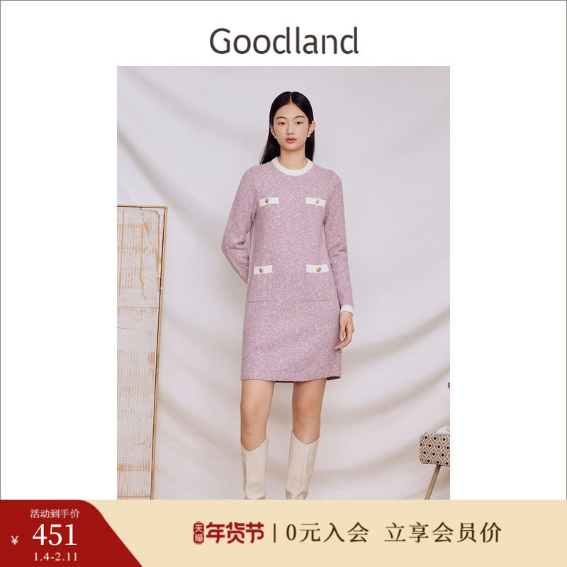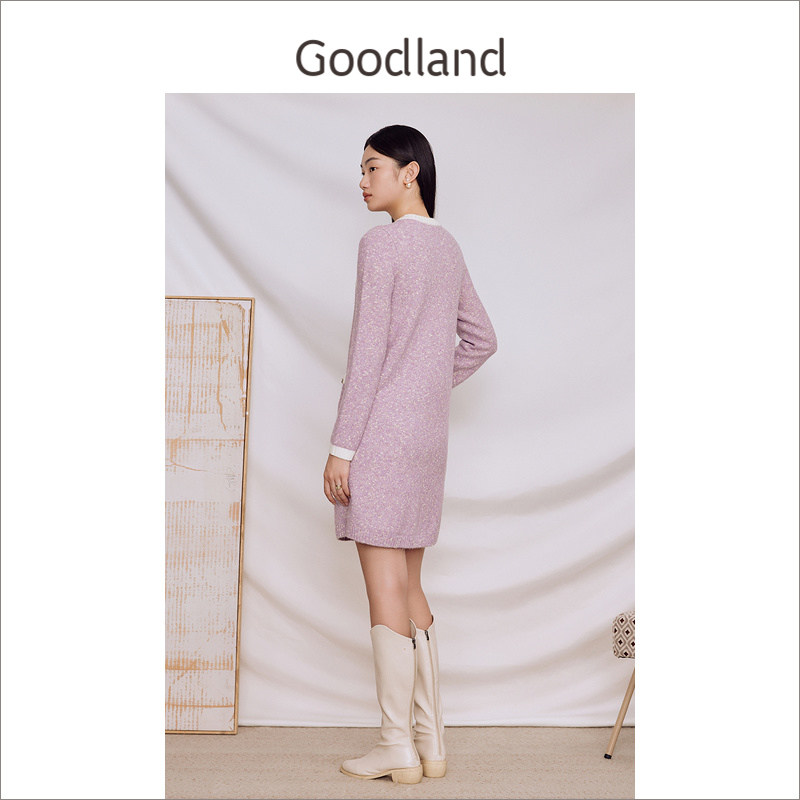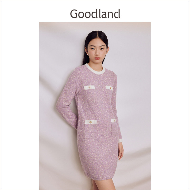 Goodland美地女装冬季香芋紫拼色针织圆领h型连衣裙