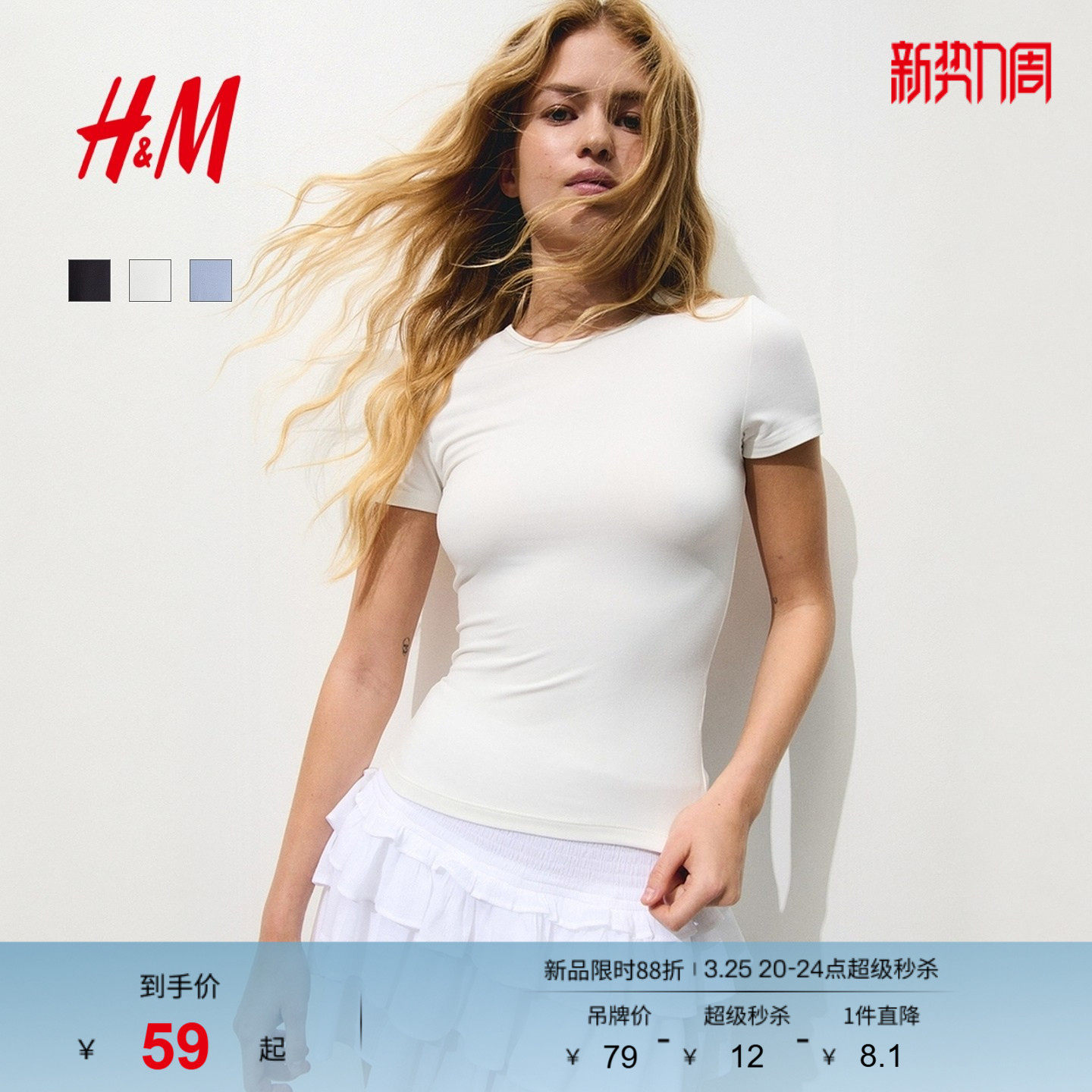 HM女装T恤春季圆领气质修身时尚简约细纤维短袖1292501