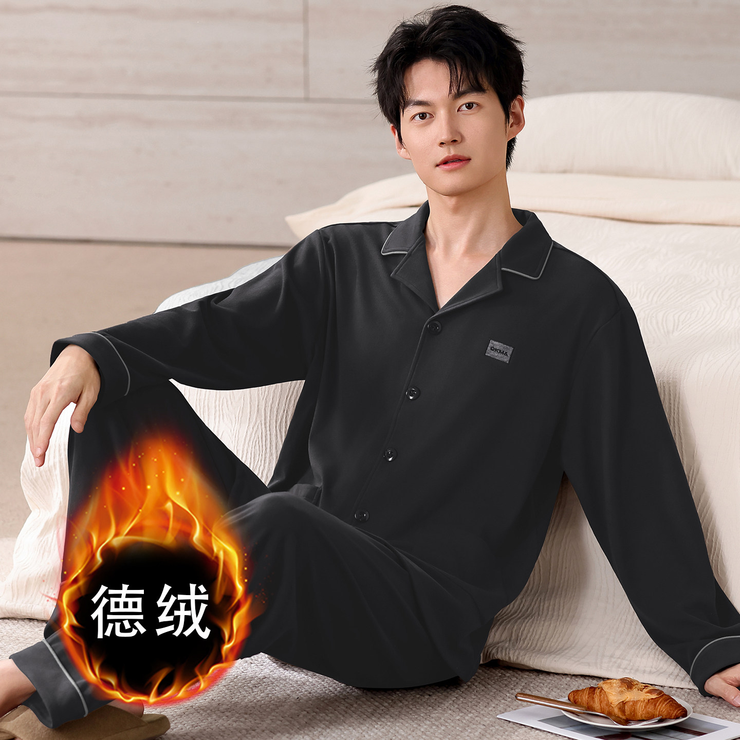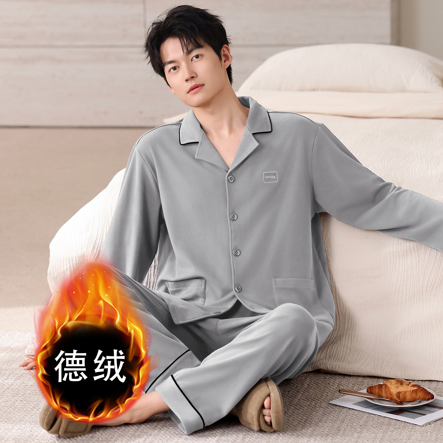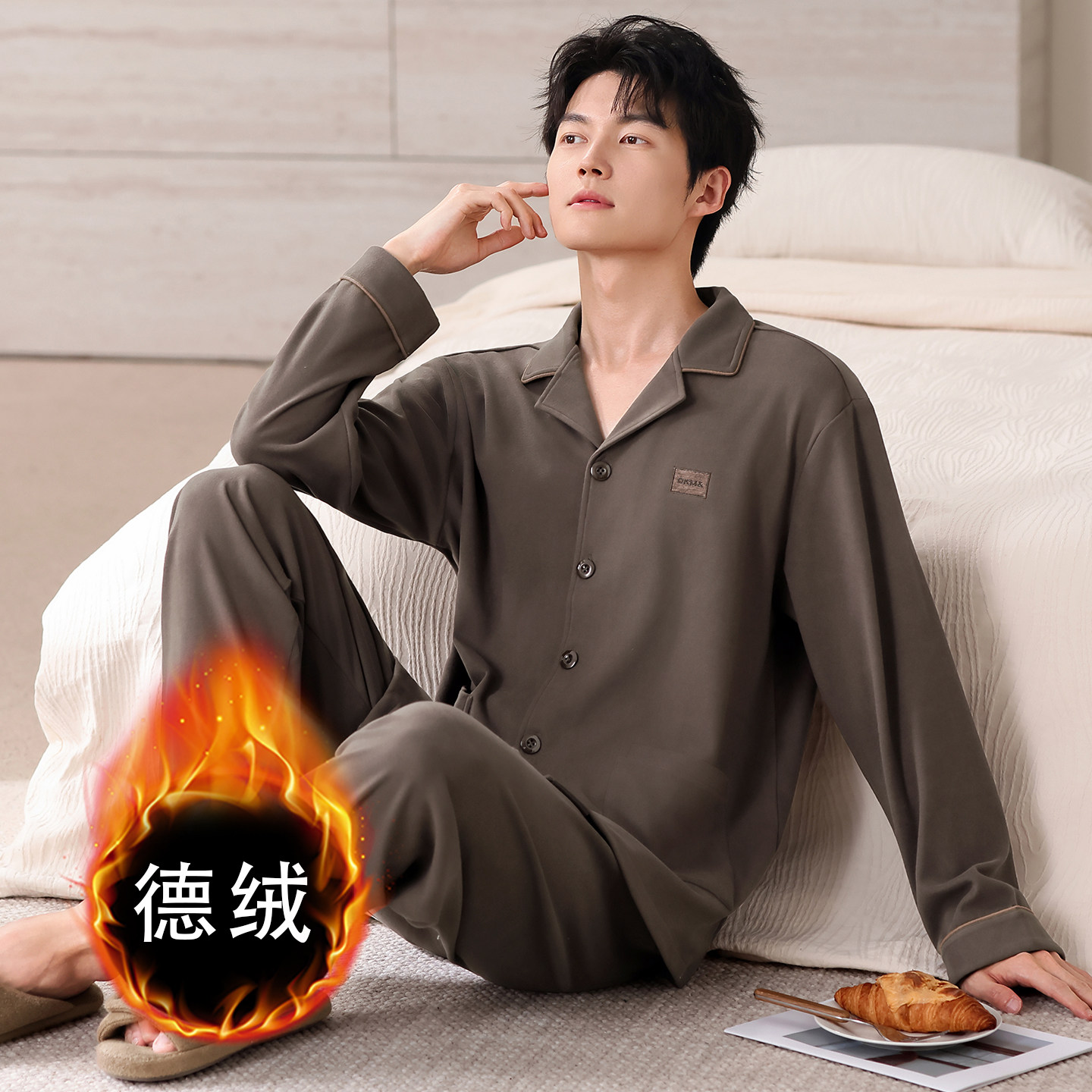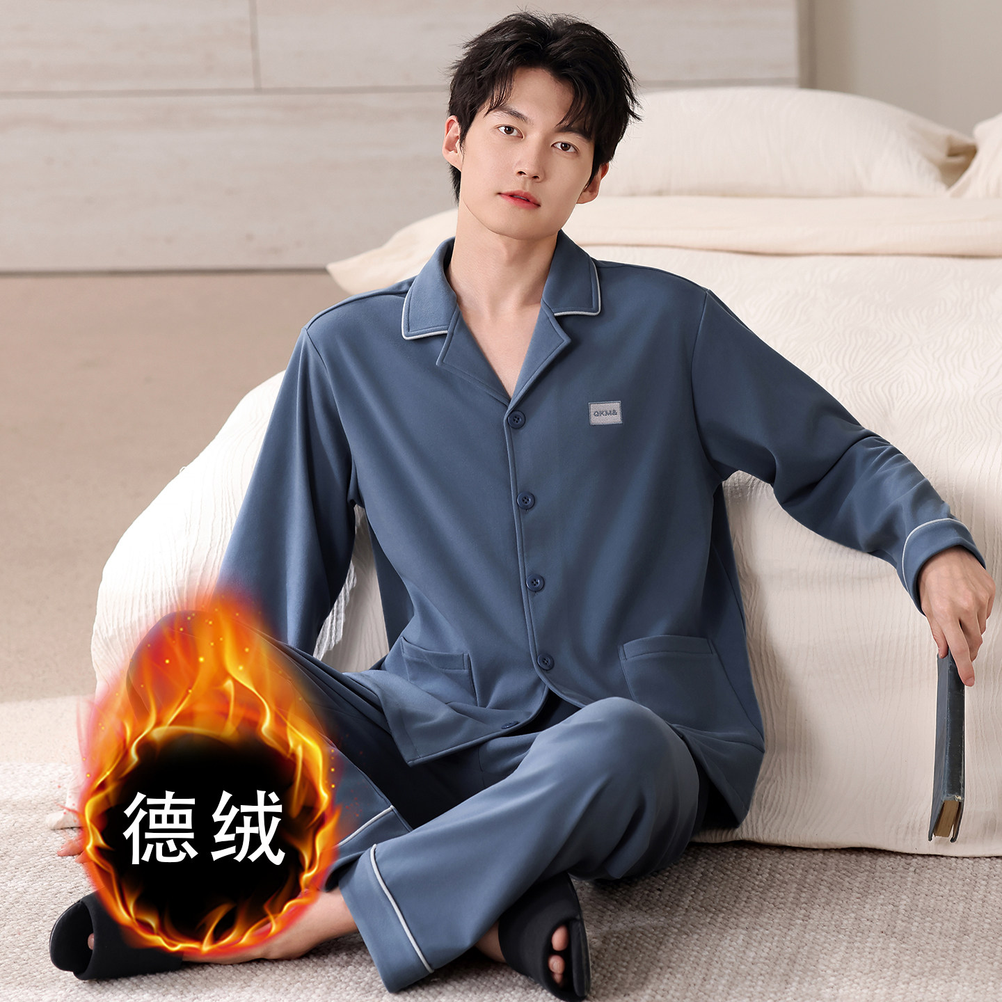 双面德绒男士睡衣秋冬季加绒加厚保暖长袖家居服套装居家棕色蓝色