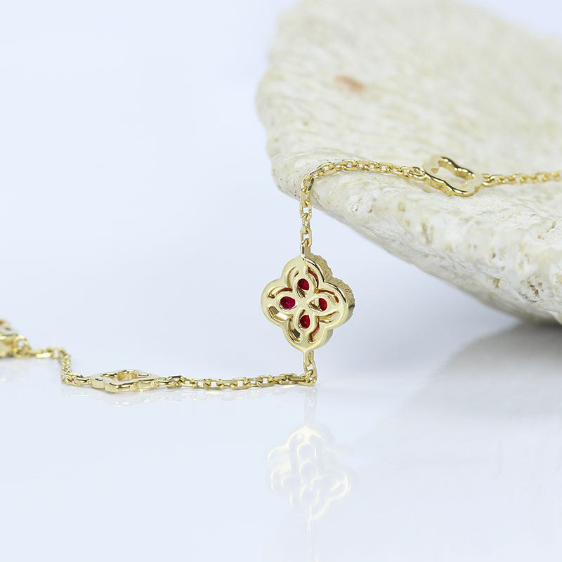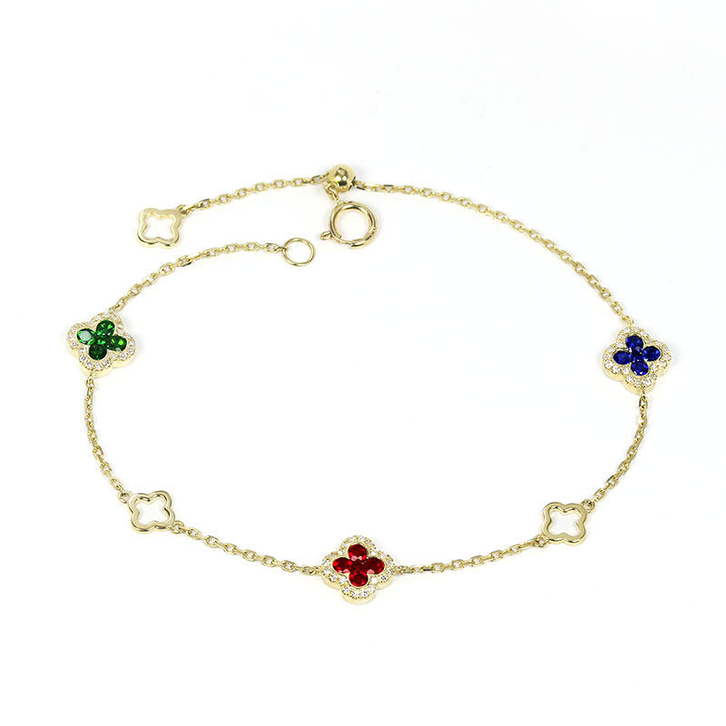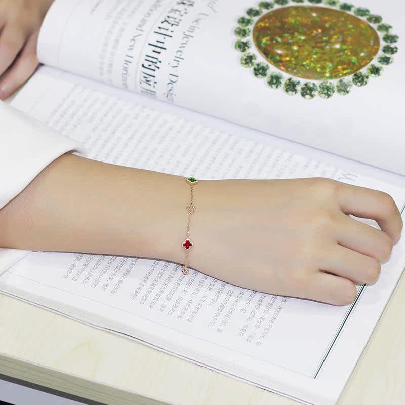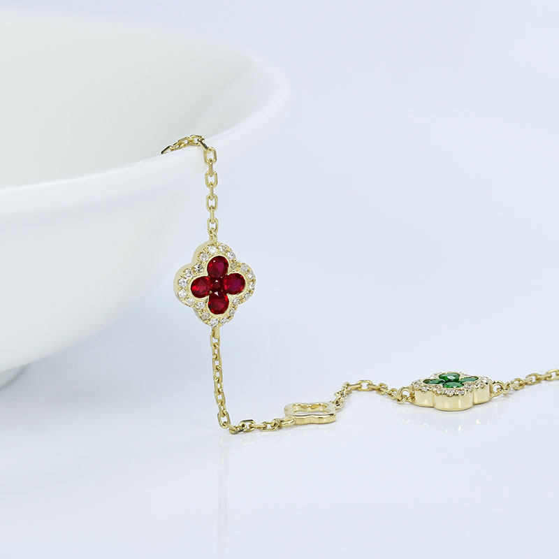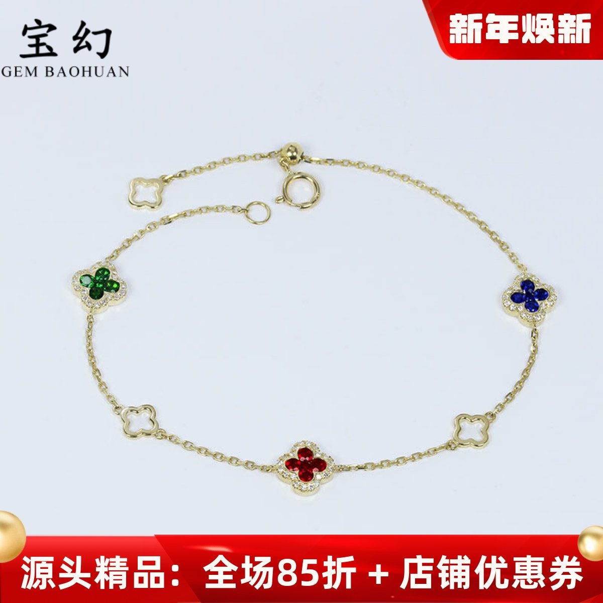 18K黄金红宝石蓝宝石沙弗莱钻石幸运四叶草手链 自由组合个性定制