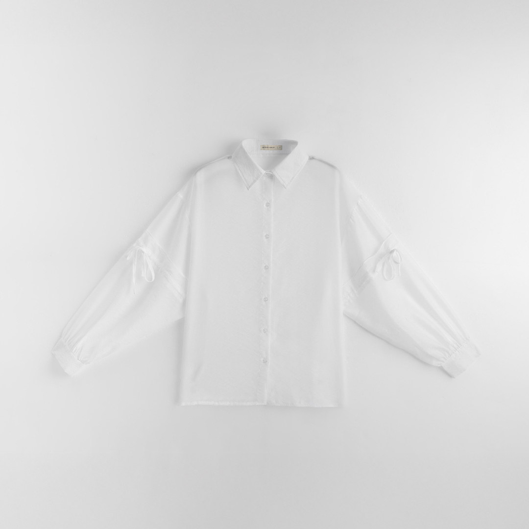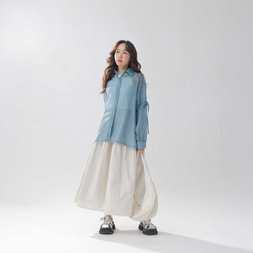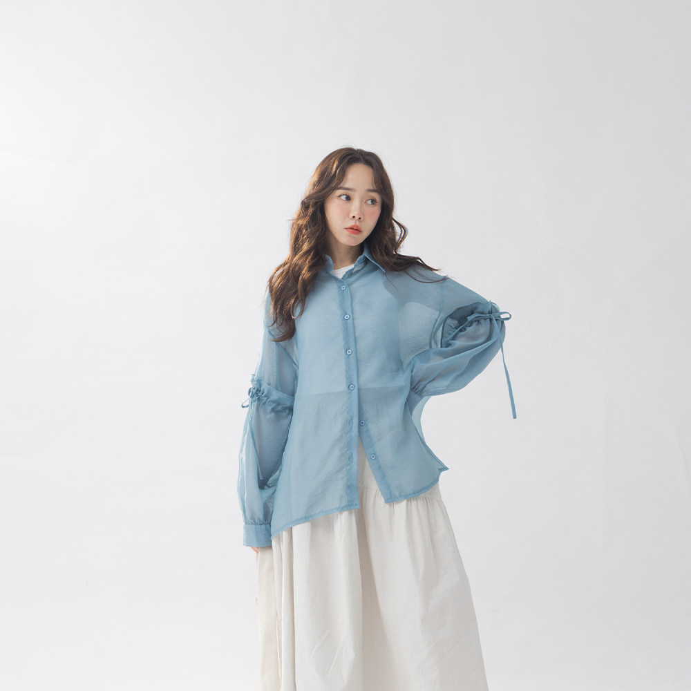 QUEENSHOP 2025秋冬新品女装荷叶绑带澎袖透肤衬衫罩衫01025673
