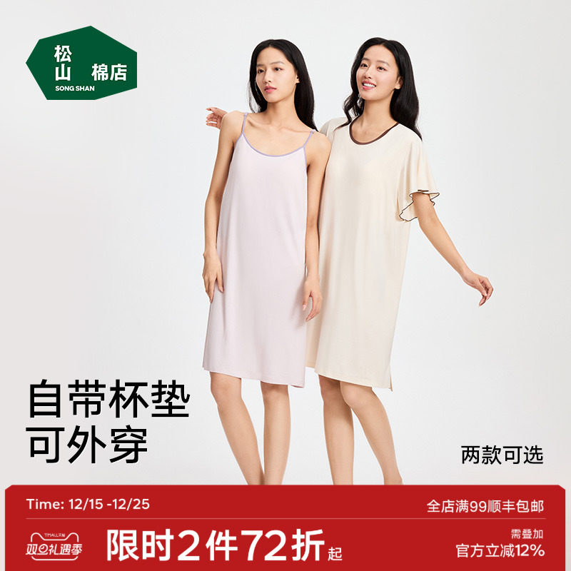 松山棉店二合一小薄荷女士带杯短袖裙莫代尔吊带睡裙女性感带胸垫