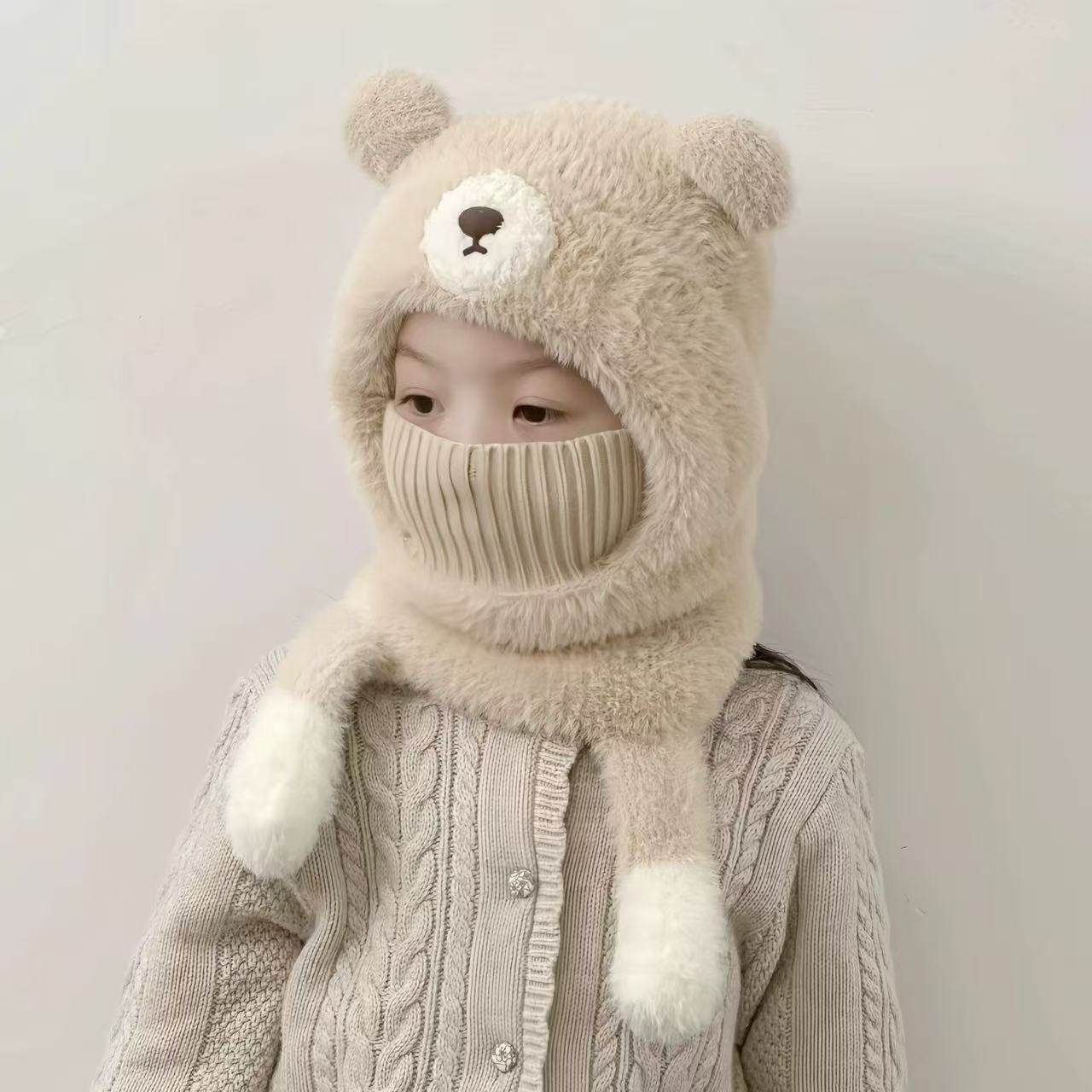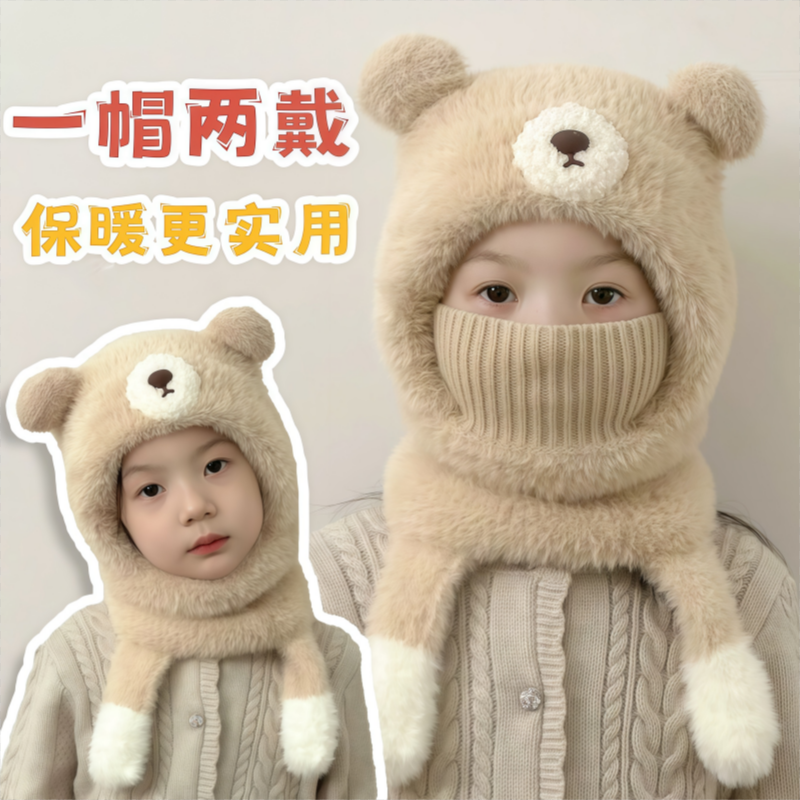 尼多熊儿童帽子围巾一体冬季防风帽宝宝毛绒护耳帽女童加厚保暖帽