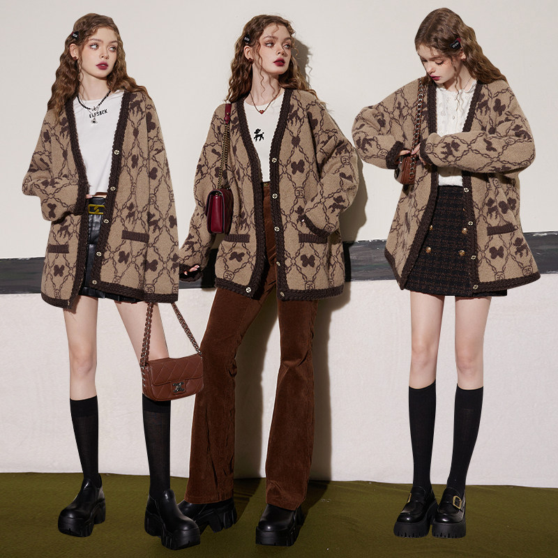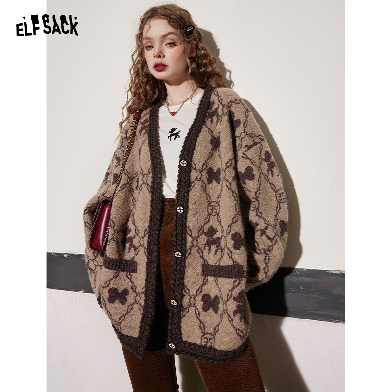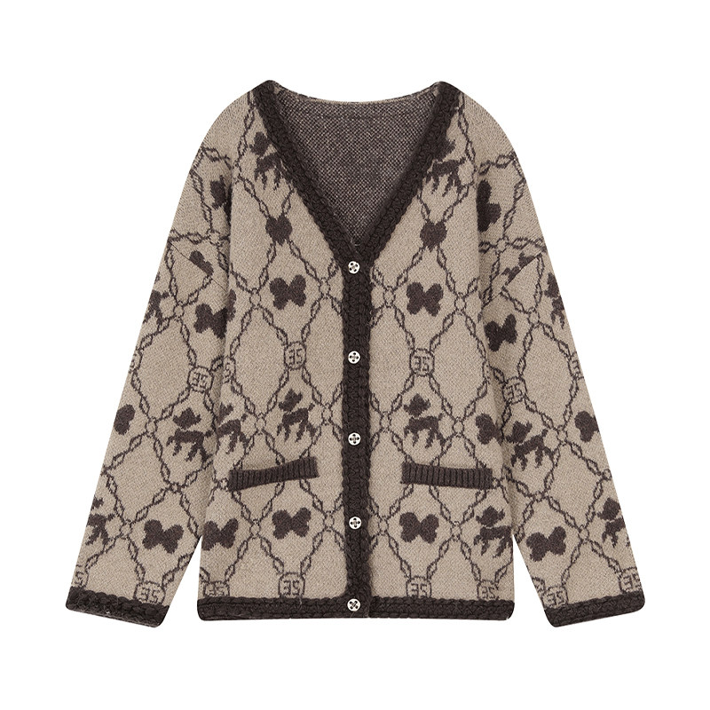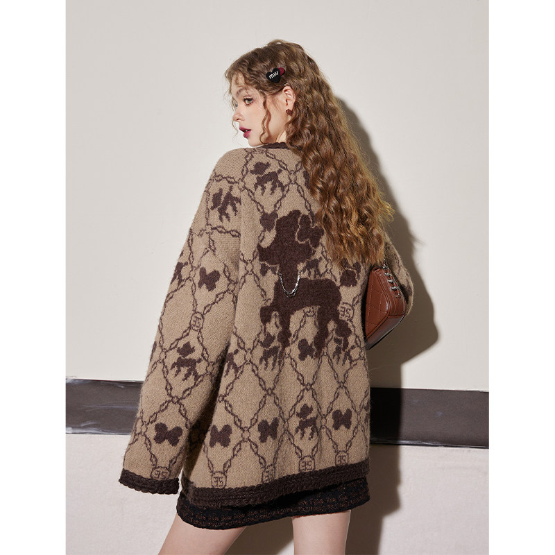 妖精的口袋老花咖色毛衣外套女2026年春秋新款老钱风慵懒高级感