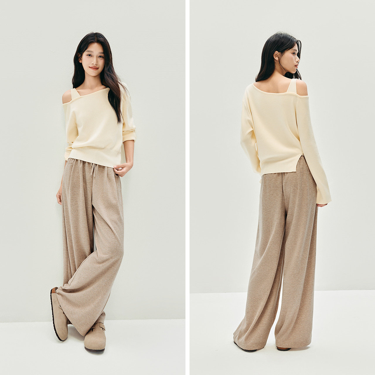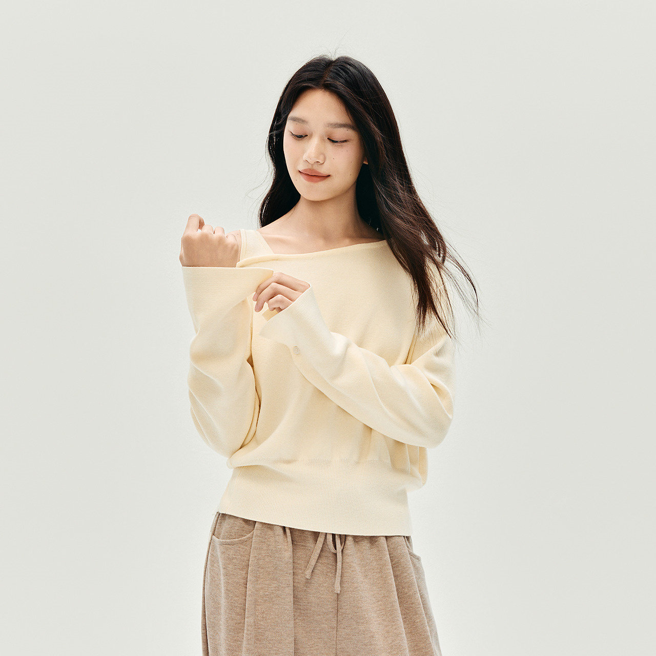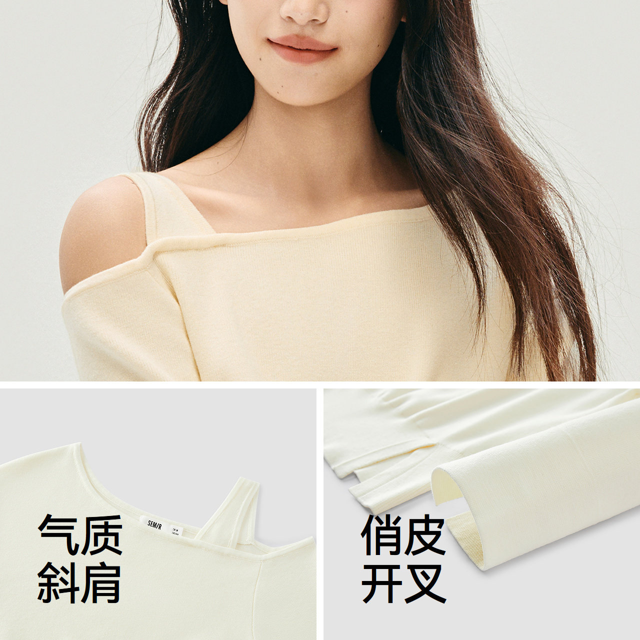 森马针织衫女冬季短款斜肩开叉白色2025新款温柔小个子设计感上衣