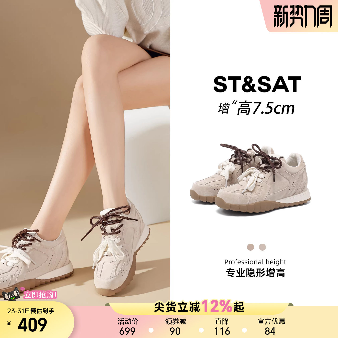 星期六7.5CM德训鞋女新款百搭复古休闲轻便隐形内增高女鞋厚底鞋