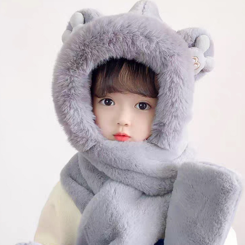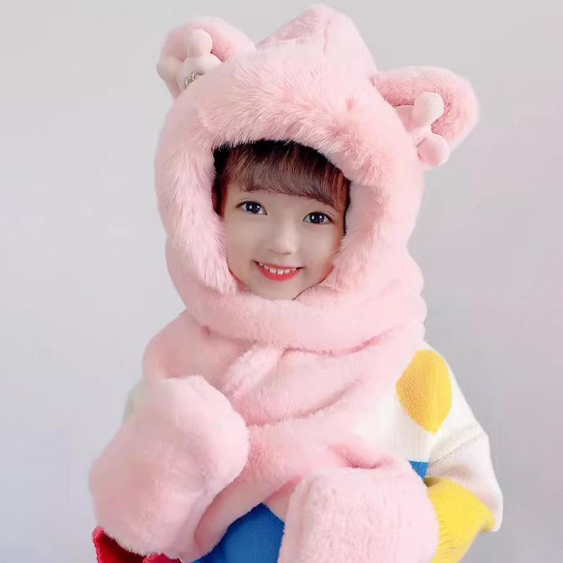 儿童冬季帽子围巾手套三件套加绒加厚女童一体帽男大童保暖防风帽