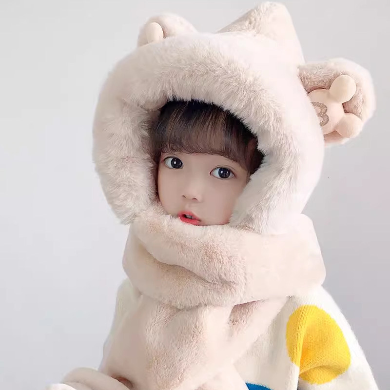 尼多熊儿童帽子围巾一体冬季防风帽宝宝毛绒护耳帽女童加厚保暖帽