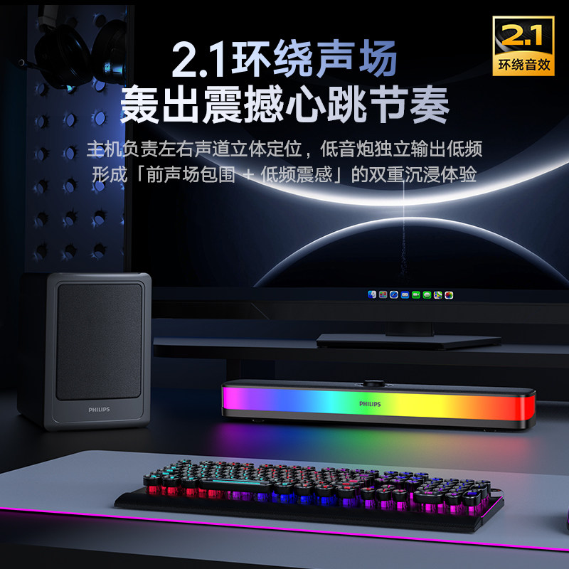 飞利浦蓝牙音响全面屏RGB灯效桌面音箱SPA6109游戏电竞带麦克风