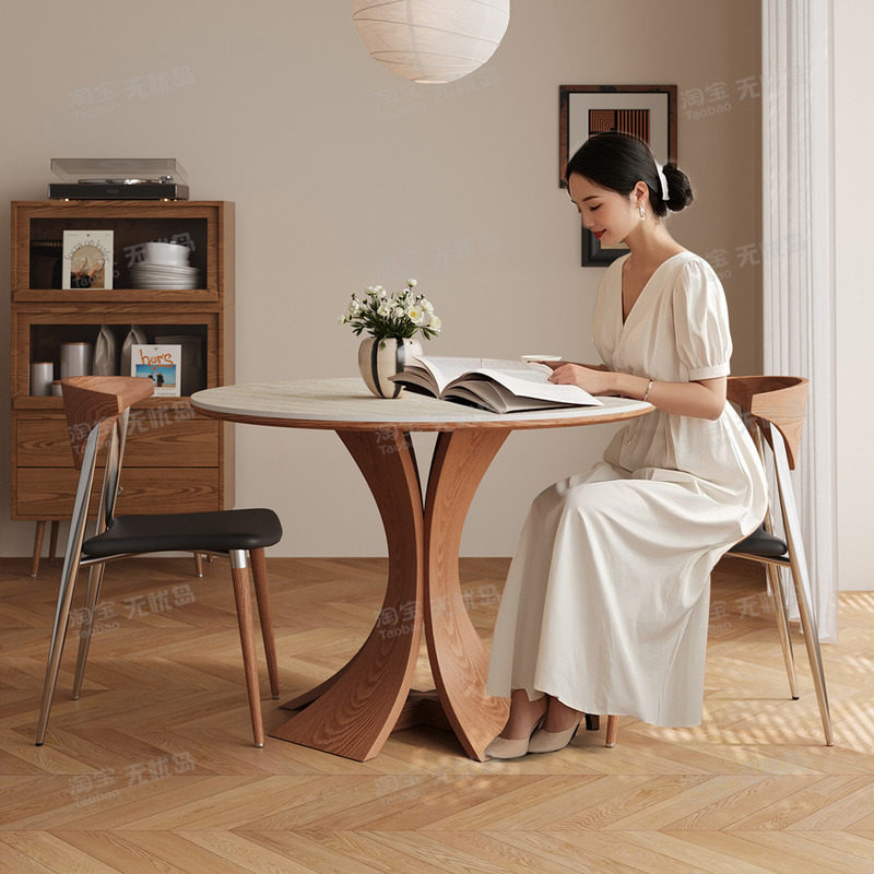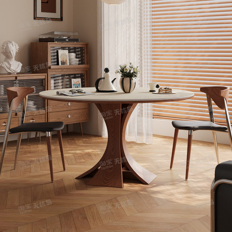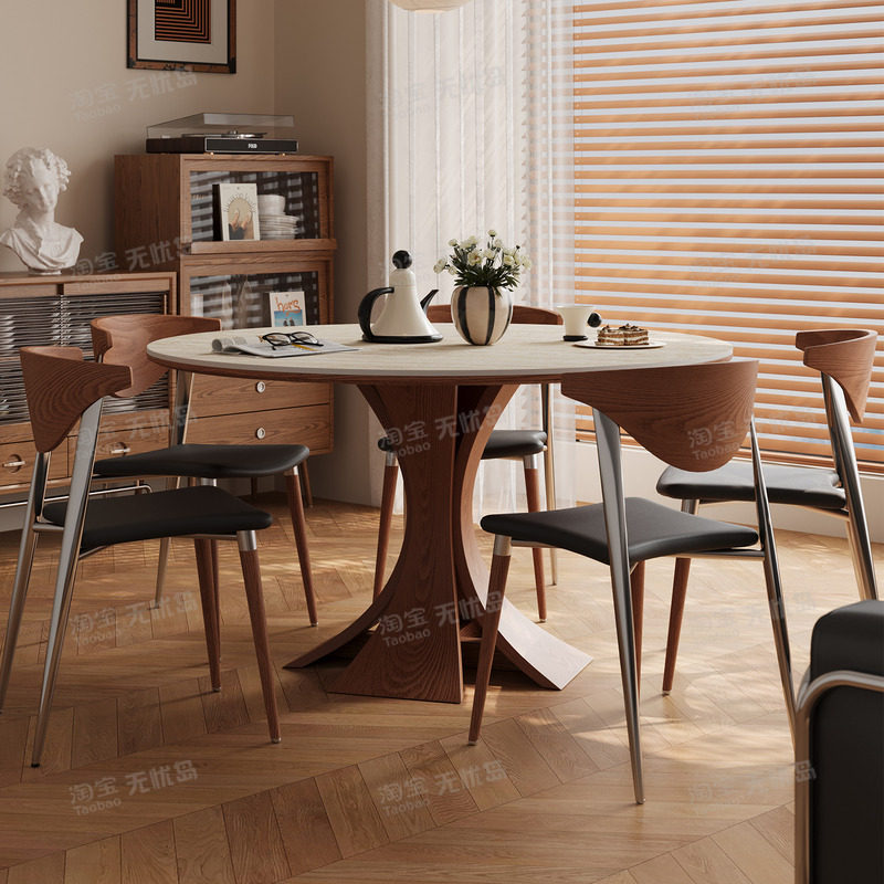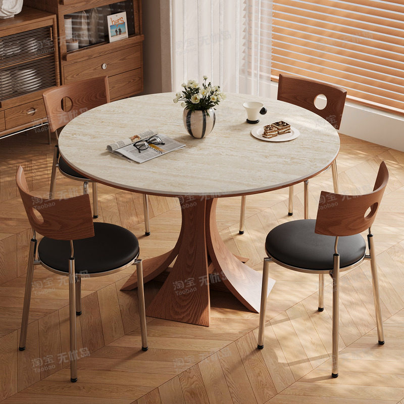 设计师岩板圆桌法式复古家用洞石岩板饭桌中古风实木圆形餐桌