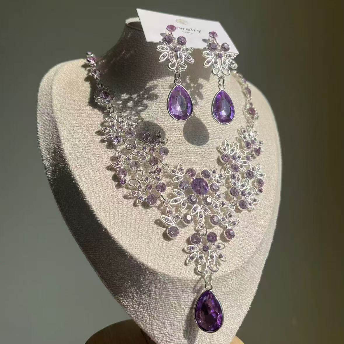 超闪紫色锆石花朵项链耳环套装女小众设计高级晚宴礼服配饰锁骨链