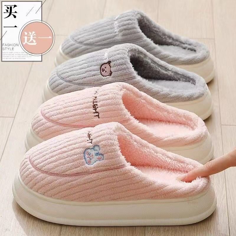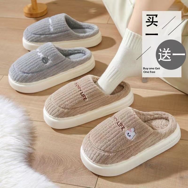 买一送一棉拖鞋女冬季外穿保暖加绒室内家居厚底包头拖鞋情侣男士