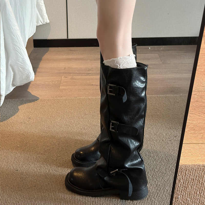 真皮~骄屿皮带扣黑色中筒裤管靴女堆堆靴长筒靴骑士靴西部牛仔靴