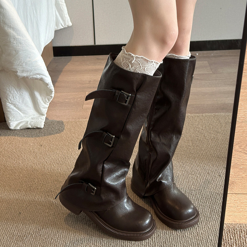 真皮~骄屿皮带扣骑士靴复古英伦风长筒靴棕色显瘦粗跟不过膝长靴