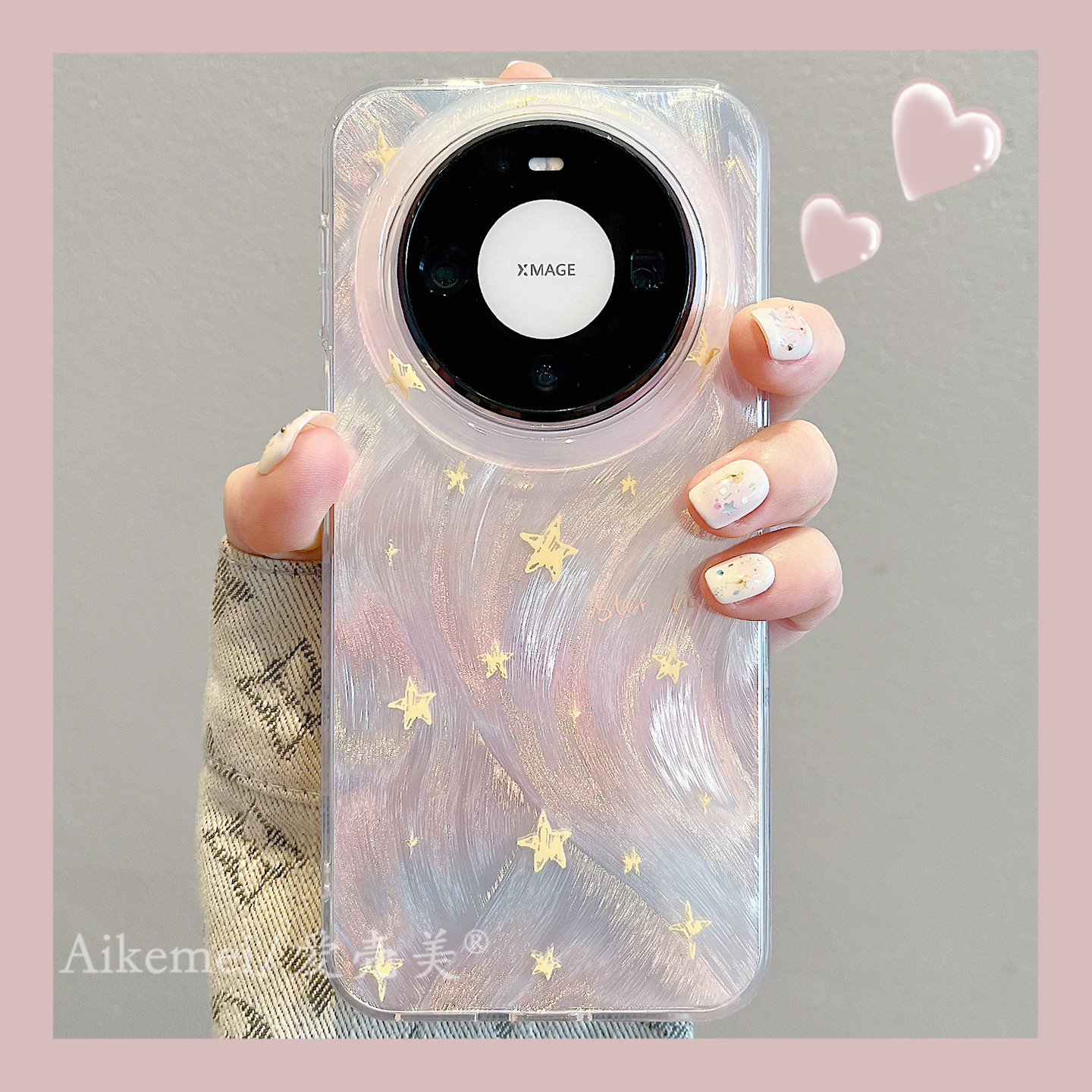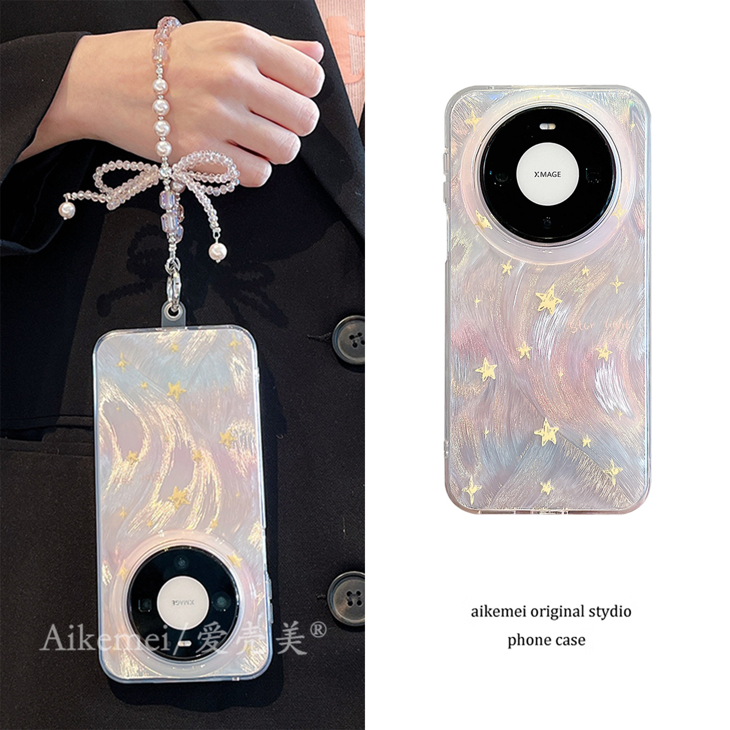 适用华为mate80promax手机壳粉色渐变羽纱纹星星Mate70pro链条挂绳mate60pro双层新款pura80pro+全包防摔女款