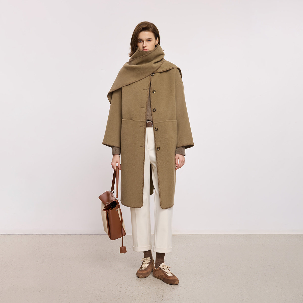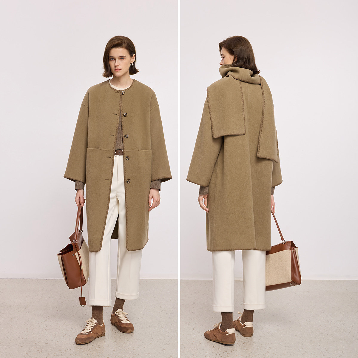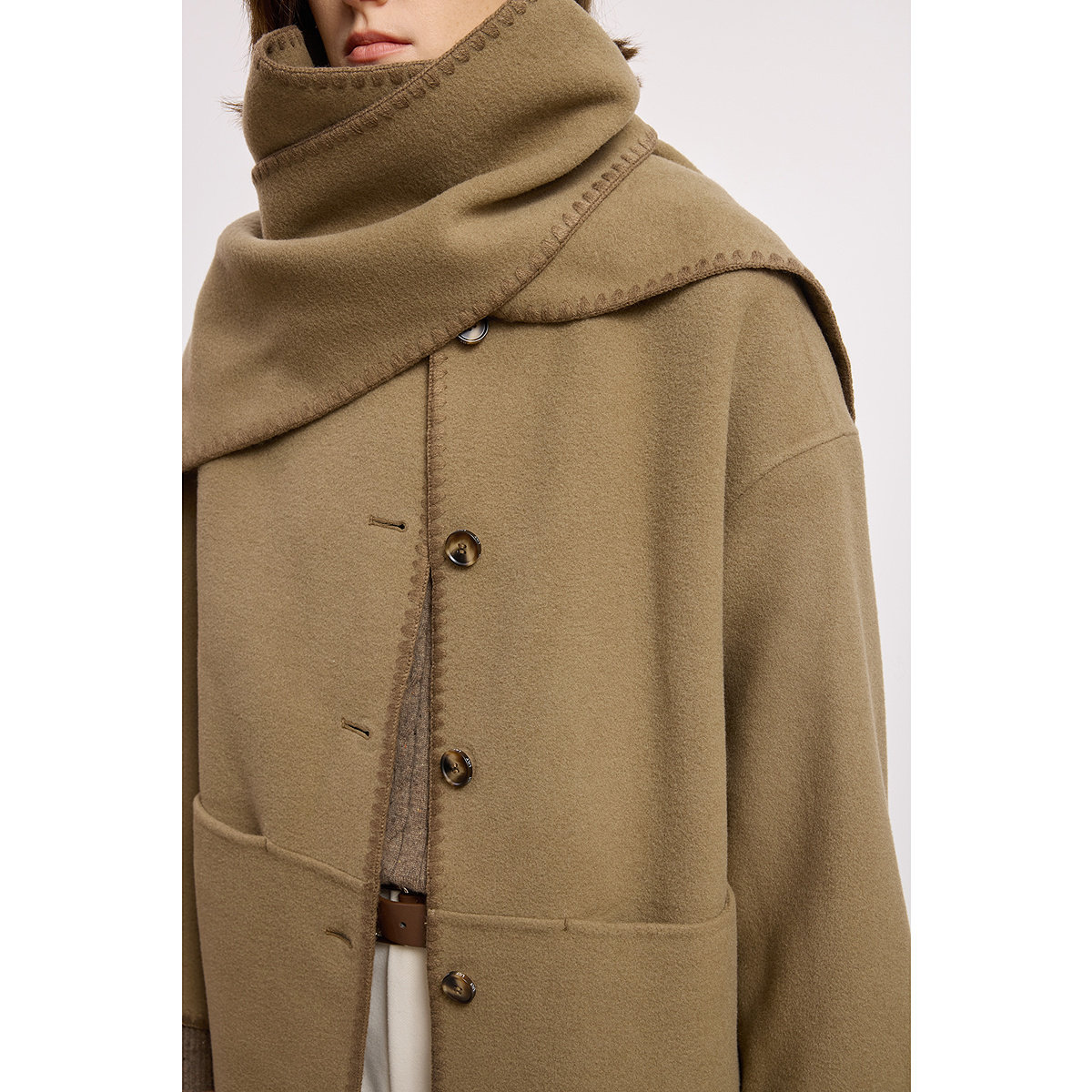 LILY2025冬新款女装羊毛混纺含围巾贝壳绣休闲气质通勤毛呢外套