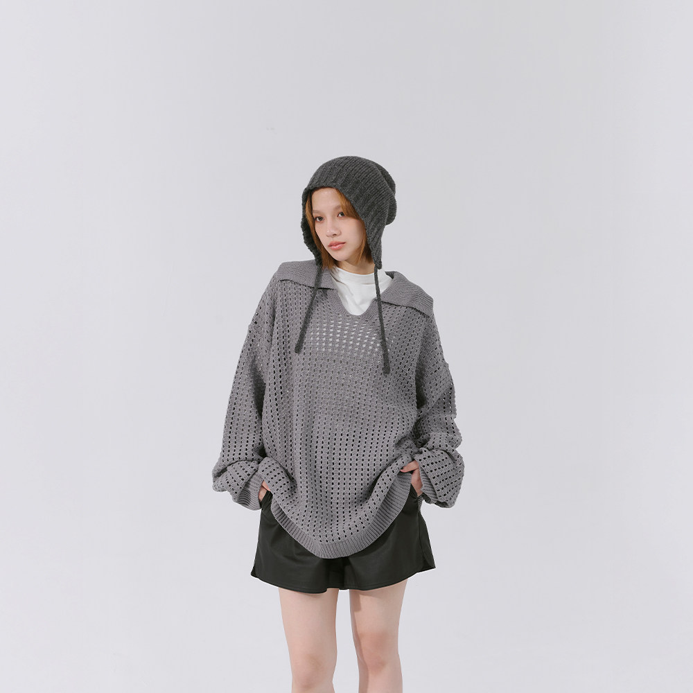 QUEENSHOP 2025秋冬新品女装中性领片镂空宽版针织毛衣01013479