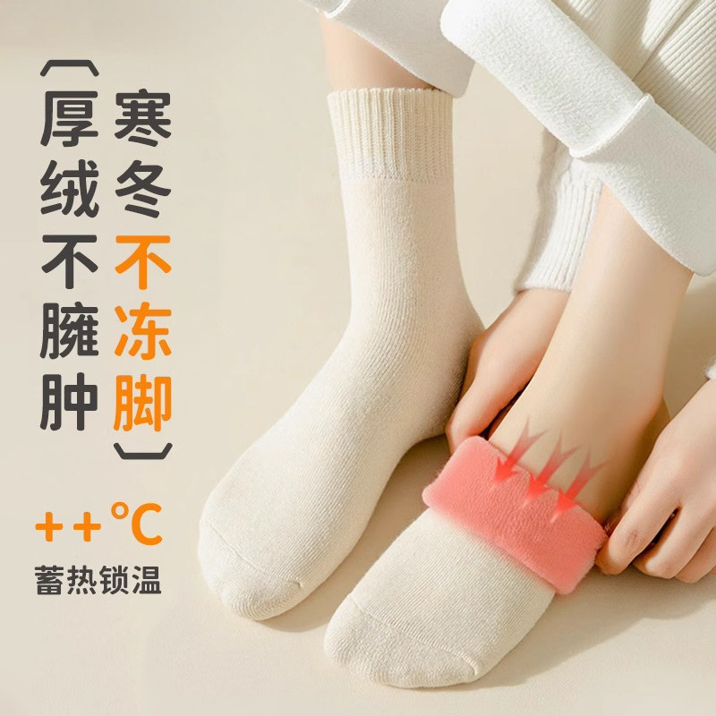 袜子女款秋冬加绒加厚中筒袜毛圈纯色棉袜保暖冬款睡眠地板月子袜