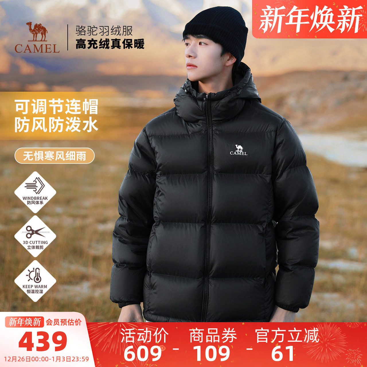 骆驼男装防泼水面包服男秋冬连帽加厚保暖鸭绒短款拒水羽绒服外套