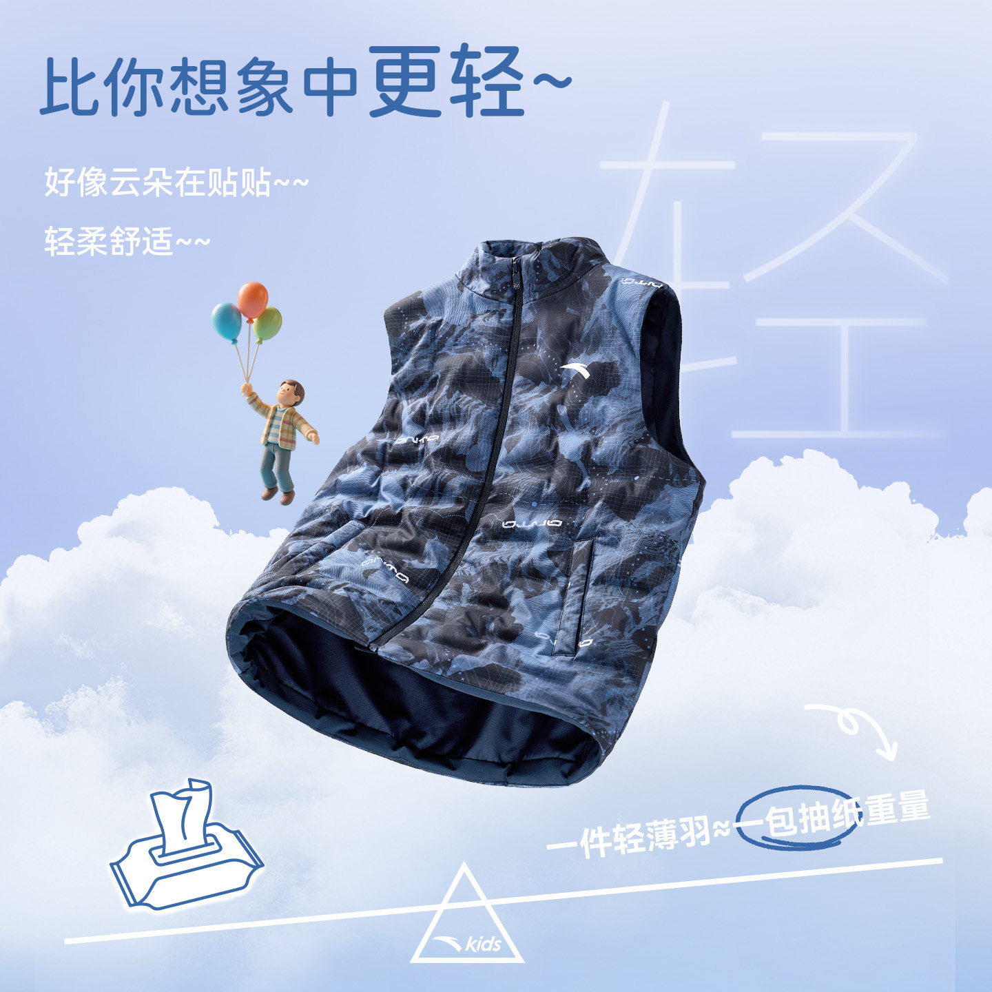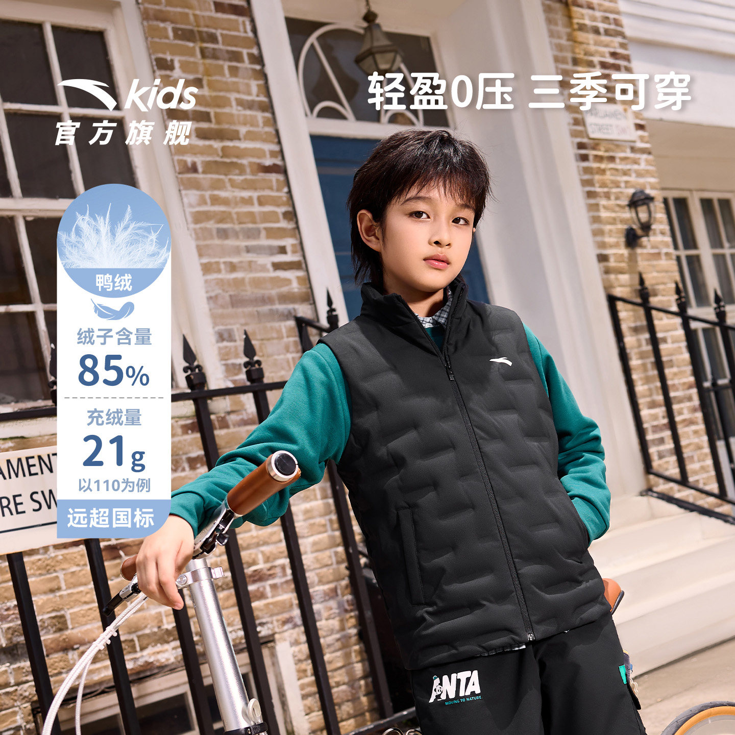 安踏儿童男女童轻薄羽绒马甲2025秋冬保暖中大童运动马甲休闲百搭