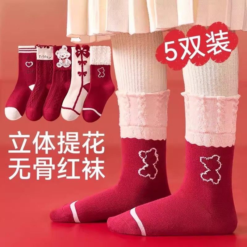 女童袜子冬季纯棉红色棉袜小女孩宝宝甜美可爱新年儿童中筒袜圣诞