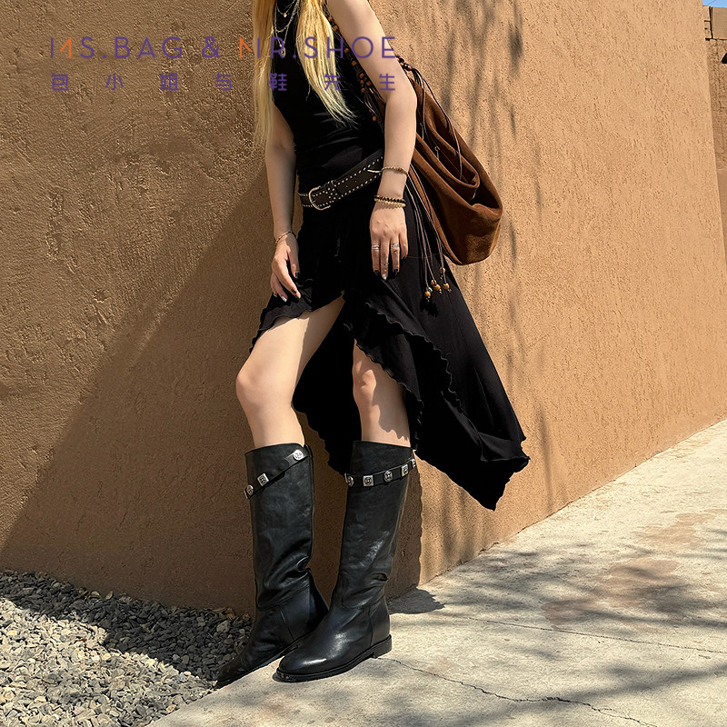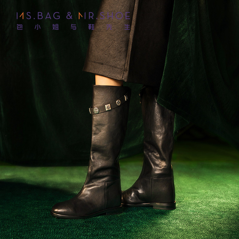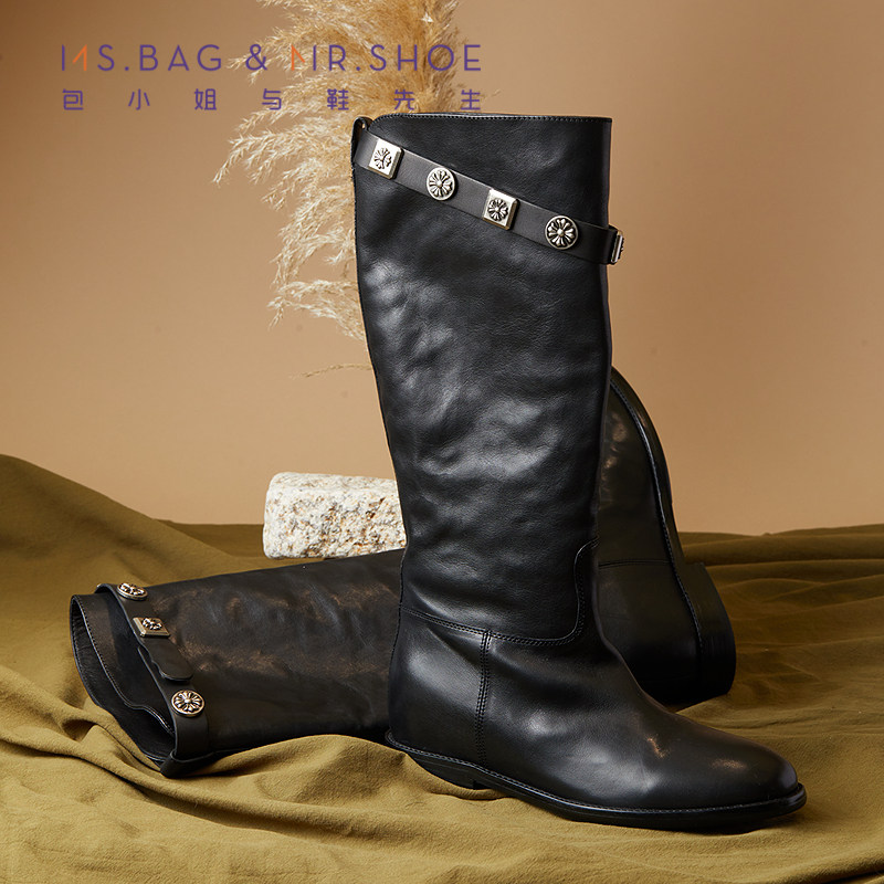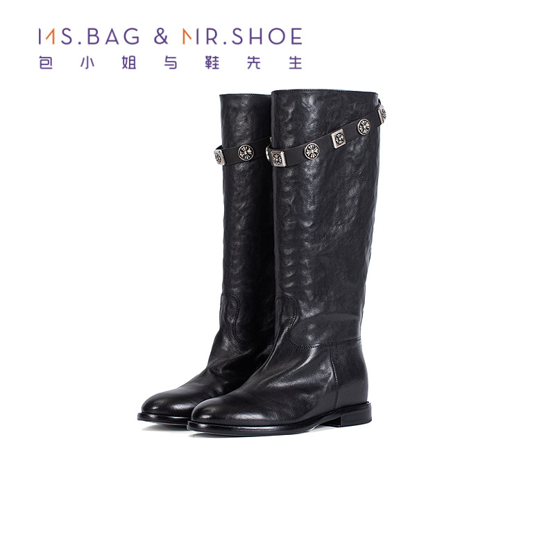 包小姐与鞋先生2025年秋季新款扣件条带牛皮低跟机车靴女253144