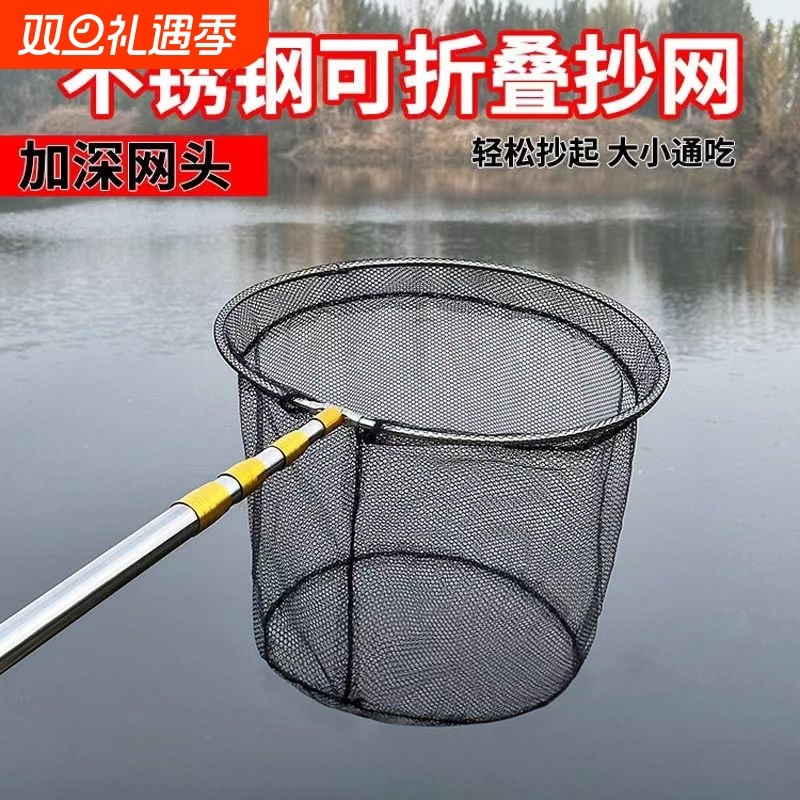 不锈钢抄网伸缩抄网杆加粗全套自由定位杆便携抄网可折叠捞鱼网头