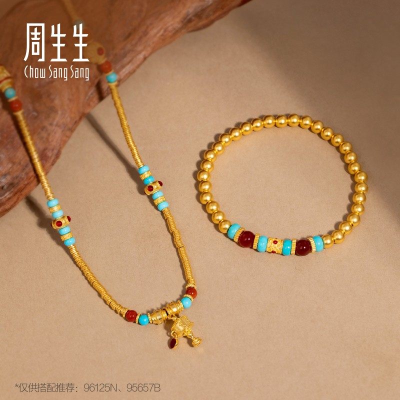 周生生东方古祖红玉髓绿松石六字大明咒古法黄金项链手串96125N