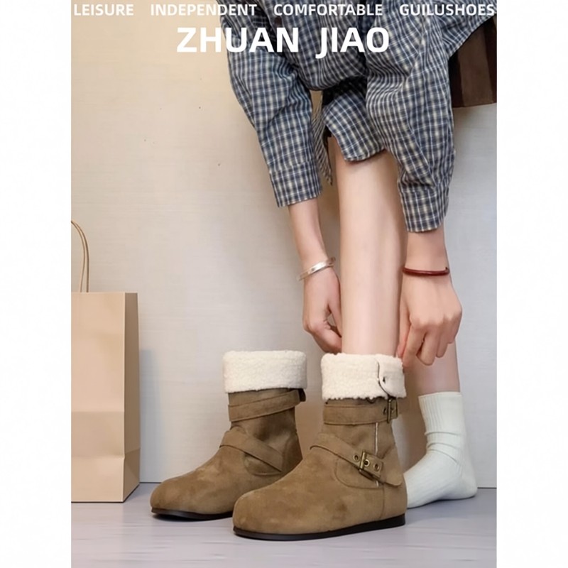 牛皮~骄屿复古圆头雪地靴加绒保暖毛毛棉靴两穿平底棕色勃肯短靴